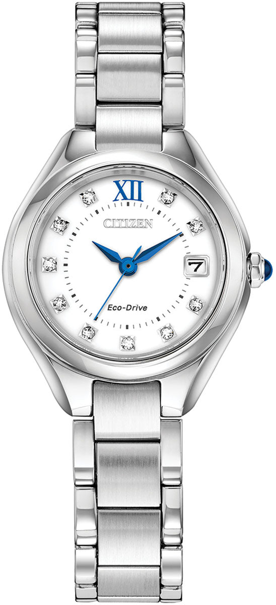 Citizen Watch Eco Drive WR50 Ladies Color. The Citizen Ladies Silhouette Crystal features crystals set on an elegant white dial with blue highlights for the hands and the 12 oclock roman numeral marker. A stunning Cabochon Crown. The stainless steel case and bracelet completes the elegant look. Water resistant to up to 50 metres. Features Citizen Eco-Drive technology powered by light, any light. Never needs a battery.