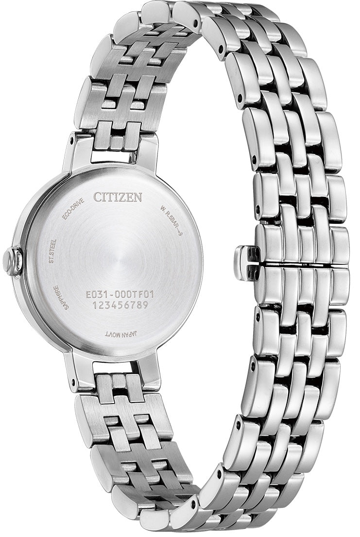 Citizen Watch L Silhouette EM0990-81L. An elegant addition to our Citizen L collection, with a petite silver-tone stainless steel case and matching bracelet. A beautiful dark blue dial features stainless steel hands and markers and can be viewed under sapphire crystal glass. Sustainably powered by any light with our Eco-Drive technology, this timepiece will match your style, lifestyle and values. Water resistance to 50 metres.