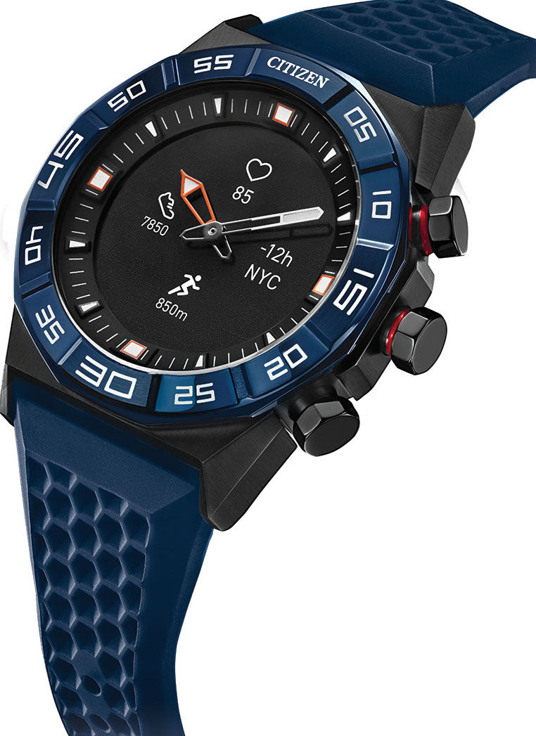 Citizen Watch Smartwatch Color. Introducing a genius timepiece like youve never seen before the new CZ Smart Hybrid has all the style of iconic Citizen design combined with the best-tech functions of a smartwatch. The impressive 15-day battery keeps up with your busy lifestyle in a distinctive design that stands out. This new CZ Smart Hybrid watch features a black ion-plated stainless steel sport bezel in blue and a 44mm case with functioning dials on the black and white display with pops of orange on the pushers and luminous analogue hands. The blue silicone integrated strap blends with the overall design and fits perfectly on your wrist. Utilise the Citizen Connected app to manage your notifications, change your dials and see your fitness stats. Stay on track with the convenience of information at a glance on your hybrid smartwatch display. You can choose the dial that fits your mood or style and customise the information on display to meet your needs including, steps, weather, heart rate, and more.