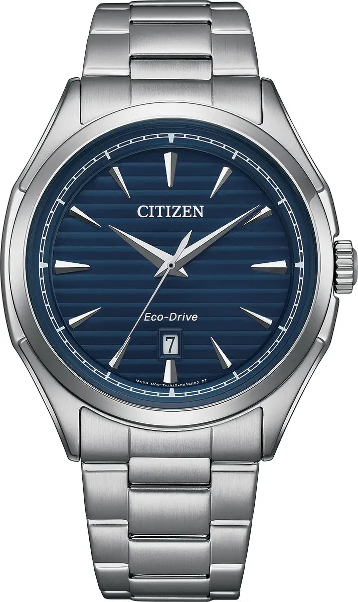 Citizen Watch Sport Mens AW1750-85L. A modern twist on a timeless look, this Ring Solar timepiece from Citizen features a blue metal dial featuring a date window at the 6 o'clock position and completed with sleek, silver-tone hands and markers. A 41mm stainless steel case and bracelet makes this timepiece perfect for work, play and everything in between. Water resistance to 100 metres. Sustainably powered by Citizen Eco-Drive technology.