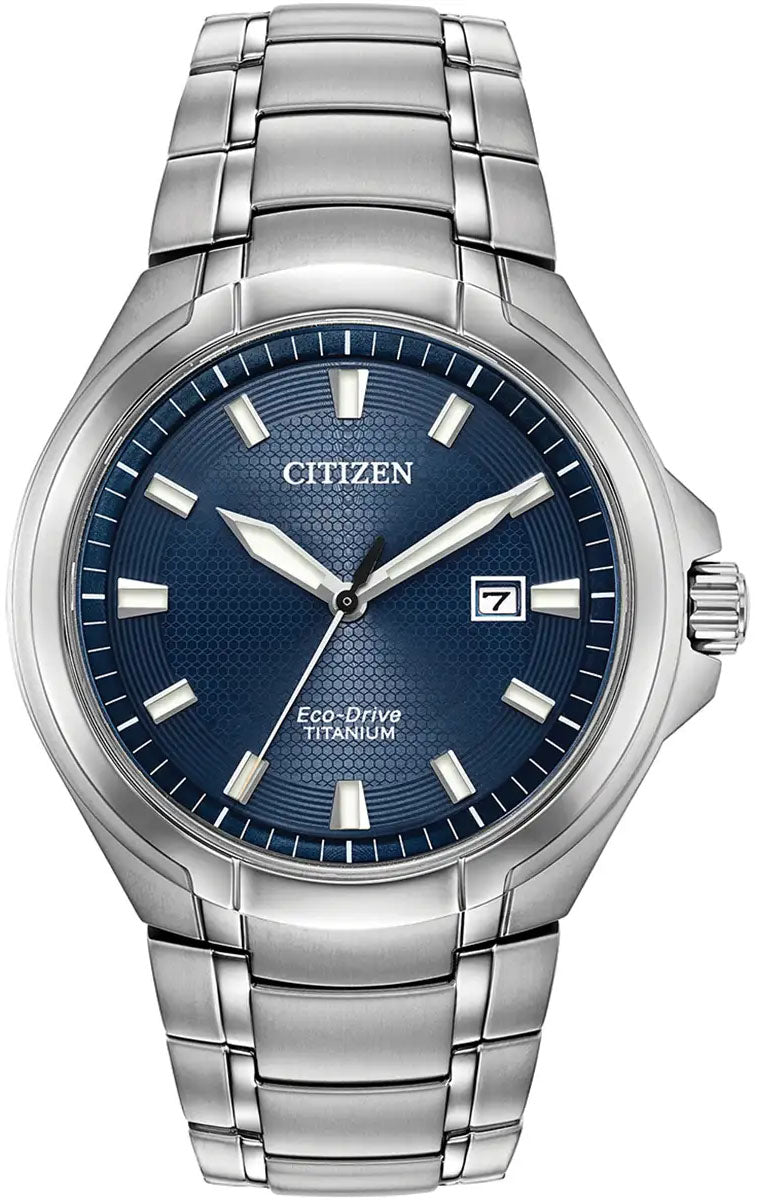 Citizen Watch Super Titanium Eco Drive Mens BM7431-51L. Make a statement with this bold Super Titanium™ watch with dark blue dial. Features include luminous hour and minute hands and markers, a date indicator and saphhire crystal. Featuring our Eco-Drive technology – powered by light, any light. Never needs a battery.