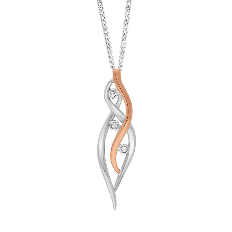 Streaming through the forests of Snowdonia National Park lies the Llugwy River that runs into one of North Wales most well-known waterfalls, Swallow Falls.The elegant waves of the waterfall flowing through the ravine is the inspiration behind the unique design of this beautiful pendant.The 925 Sterling Silver and 9ct Rose Gold curves representing the waves, while the sparkling White Topaz they cradle represents the foaming of the flowing current.