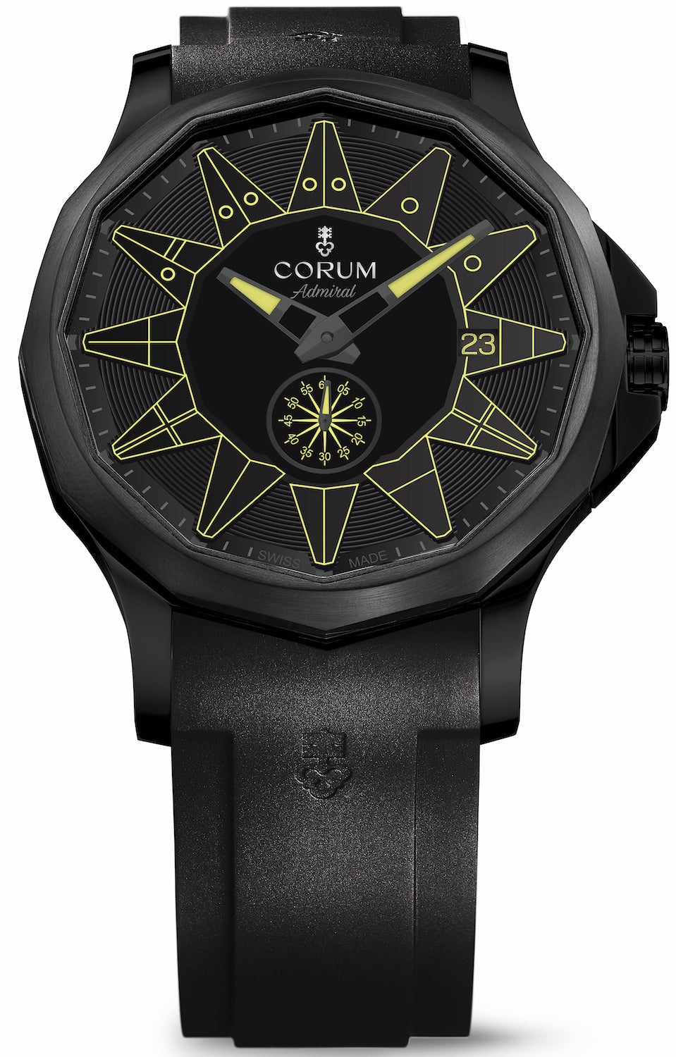 Corum Watch Admiral 42 All Black Yellow A395/04008. Acknowledged both for the aesthetic appeal of its models and for its technical excellence, Corum watches is proud to contribute to perpetuating the time honored values and expertise of Fine Watchmaking. Since 1955, Corum has adopted creativity and boldness as its guiding principles.