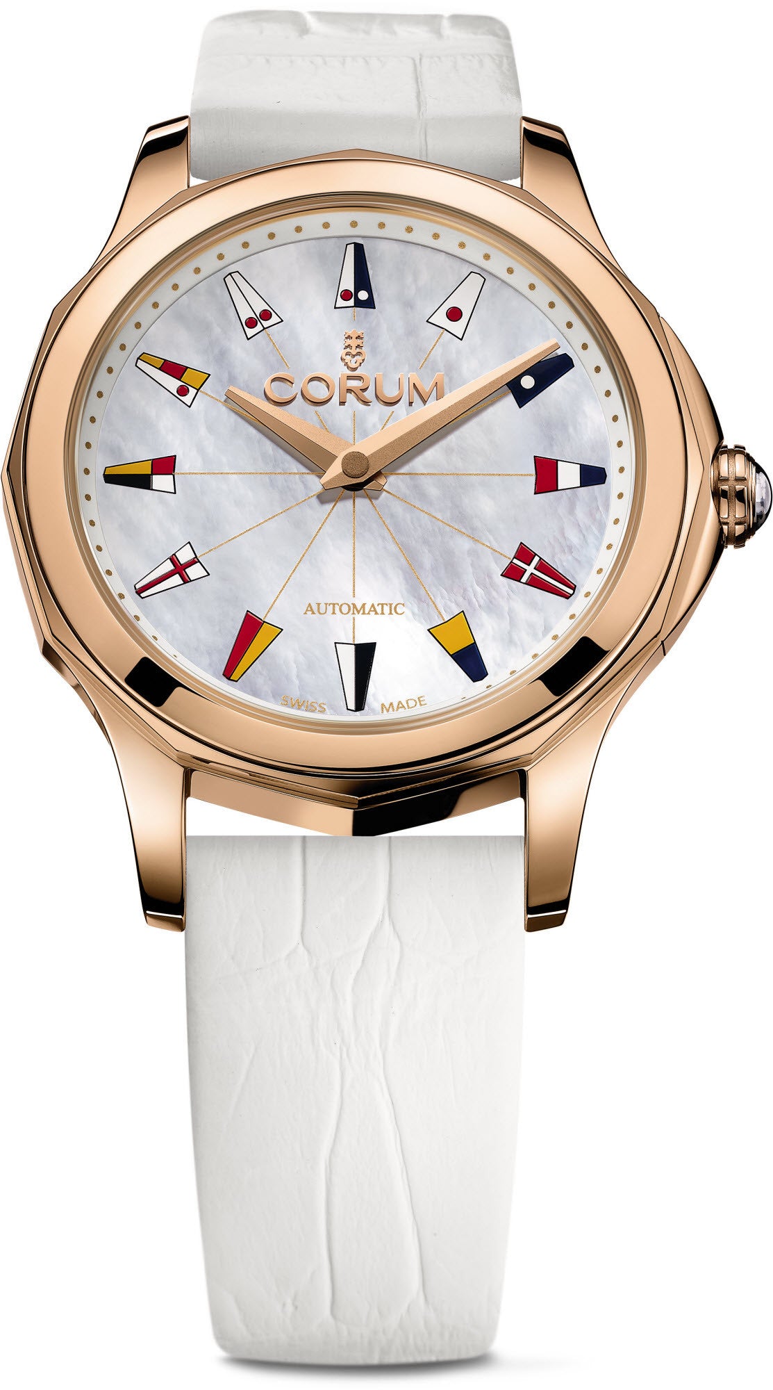 Corum Watch Admiral Legend 32 A400/02903. With all sails set, the new Admiral Legend is afloat on a feminine ocean of colour. This sporty model features an alluring touch of tropical passion, emblematic lines and colourful pennants, backed by a movement bearing the Corum signature.