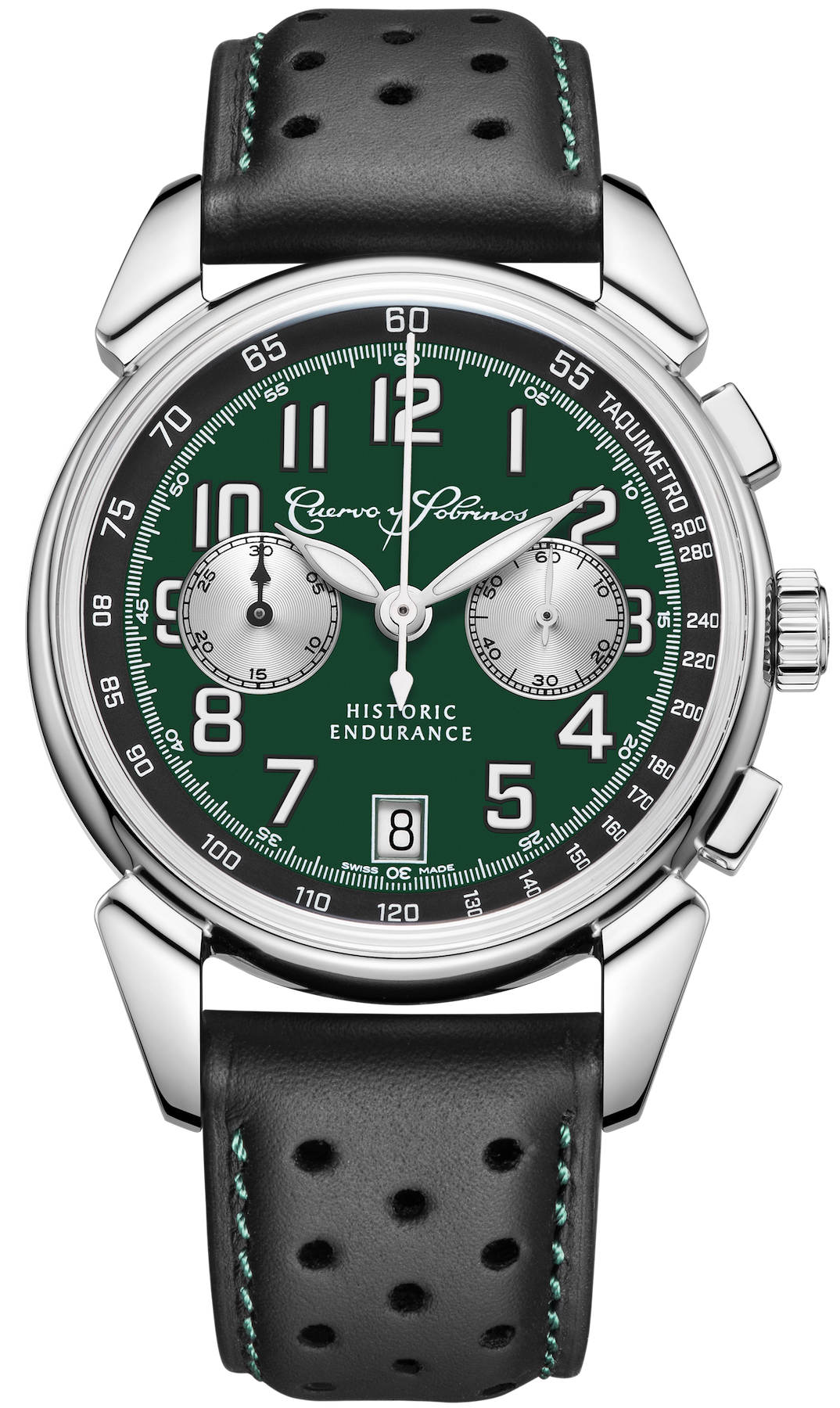 Cuervo Sobrinos Watch Historiador Historic Endurance Limited Edition 3144..1HV. Cuervo y Sobrinos, the Official Timekeeper of Iberian Historic Endurance, is pleased to unveil a limited-edition chronograph, the aptly-named Historiador Historic Endurance. The model has a bicompax dial presented in British Racing Green with contrasting silver-toned counters, two colours that are synonymous with motorsport. Housed in a 40mm stainless steel case, this watch should suit most wrists, especially those clad in racing overalls.