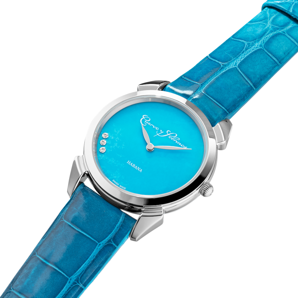 Journey back in time with the Primera Dama watch series by Cuervo Y Sobrinos, a fascinating blend of cultural history and fine Swiss watchmaking. Primera Dama watches are crafted solely for the wrists of females and boast dainty proportions and vibrant dial colours that command attention. Yet, the sophistication behind the watchmaking within this series does not go unnoticed. Examples of horological finesse are in abundance in each design, including this Primera Dama watch reference 3113.1SLB, which presents the time on a captivating blue sandstone dial adorned with a three diamond decoration at 8 o’clock.