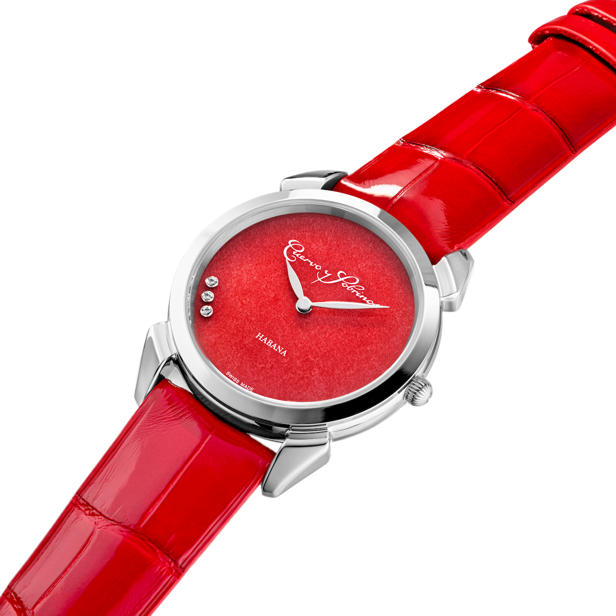 The Cuervo Y Sobrinos Primera Dama watch reference 3113.1SR measures a 36mm in diameter and is crafted from polished stainless steel with smoothly sculpted lugs that lead to a coral coloured Louisiana alligator leather strap with a polished steel buckle that has been stamped with the CyS logo. This Primera Dama watch is powered by an accurate quartz movement for uncompromised reliability.