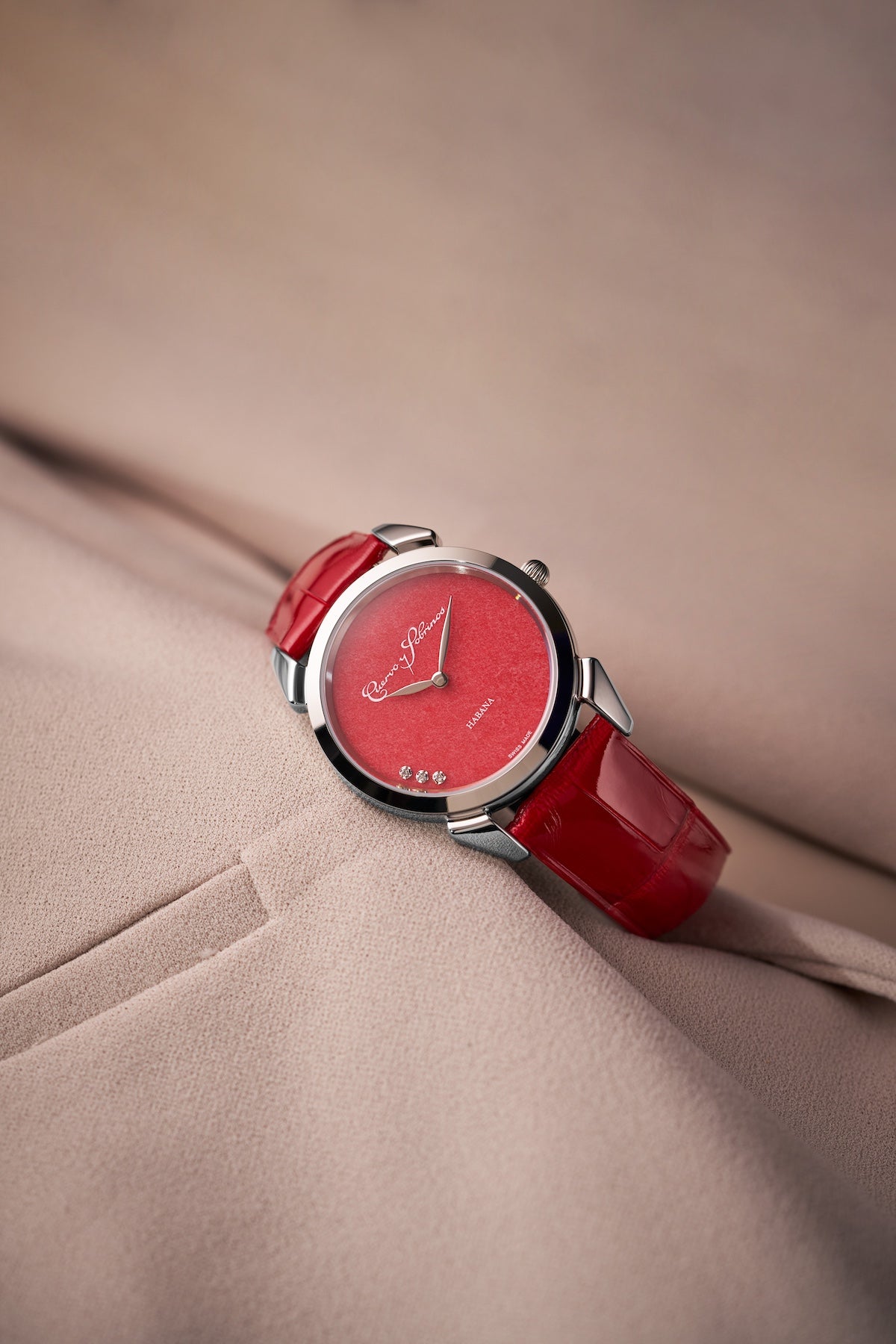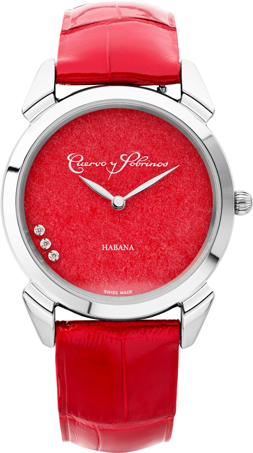 Prepare yourself for the iridescent beauty of the Primera Dama watch made by artisans at Cuervo Y Sobrinos, and the allure of their dials, which lie at the heart of every design. These striking colours shine and shimmer with an iridescent nature, paying homage to the influential women of the 1960s who would wear such extravagant designs to express their personality and unique taste in fine watches. Some of these designs are enhanced by either three or twelve diamonds along the hour track and leaf shaped hands that capture the golden years of Cuba perfectly. This stunning Cuervo Y Sobrinos Primera Dama watch reference 3113.1SR presents the time on a captivating jade stone dial adorned with a three diamond decoration at 8 o’clock. Elegantly carved leaf shaped hands bring the entire dial to life under a double curved sapphire crystal glass front.