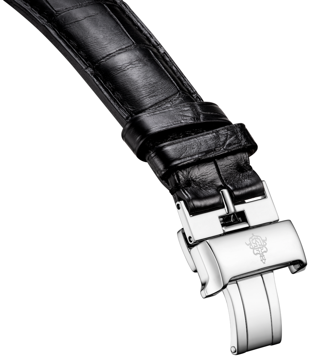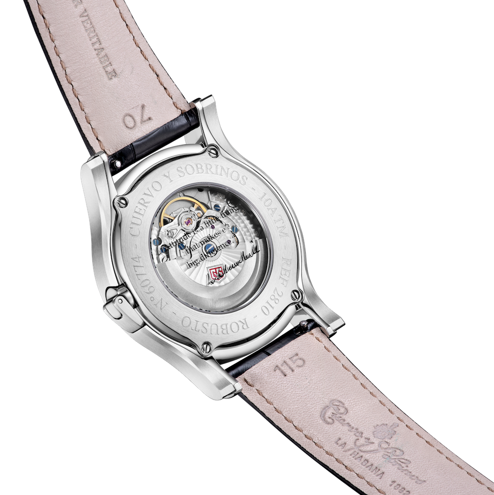 The Cuervo y Sobrinos Robusto Churchill Day Date Limited Edition maintains elegance, sophistication and timeless design with a 43 millimetre stainless steel and titanium case adorned with contrasting polished and satin-finished surfaces and a choice of two straps, the first a rich brown Louisiana alligator leather strap and the second a stainless steel and titanium bracelet. The case continues to impress with a hinged lever at 3 o’clock to serve as the crown which can be used to wind and control the CYS 5206 automatic winding movement. Based on the ETA 2834 calibre, the movement is responsible for the unbeatable precision of the stainless steel hour, minutes and seconds hands and the date and day window at 6 o’clock. The movement also assures a power reserve of 42 hours and is equipped with a finished oscillating weight with engraving as seen through the exhibition case back. The Cuervo y Sobrinos Robusto Churchill Day Date is completed by sapphire crystal glass, Clou de Paris finish on the salmon guilloche dial and a 100 metre water resistant rating.