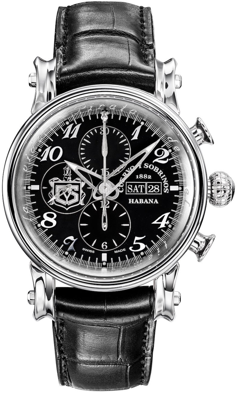 Cuervo y Sobrinos Watch Torpedo Pirata Chrono 3051.1NDD. Cuervo y Sobrinos watches hold a unique position, a tradition and identity which differentiates the brand created in Havana from any other luxury watchmaking company. Cuervo y Sobrinos is the only traditional Swiss fine watchmaking enterprise which can boast a real and proven Latin heritage.