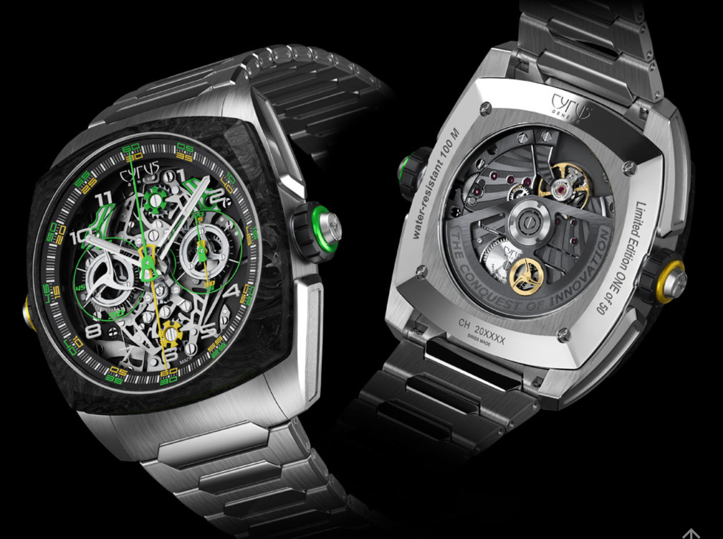 Cyrus Watch Klepcys Dice Lime Carbon Bracelet Limited Edition 539.508.TCM.B. Inspired by timing demands for sporting competitions, Klepcys DICE (acronym for Double Independent Chronograph Evolution) is an innovative “Double Independent Monopusher Chronograph. First introduced in 2021, the latest addition to the DICE family is the “Klepcys DICE Lime Carbon. With a modern look, it features a new luminescent carbon fiber bezel and, for the first time, a titanium bracelet.