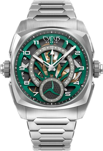 Cyrus Watch Klepcys GMT Palm Green Bracelet Limited Edition 539.507.TTM.C Palm Green. Designed to be a user friendly time instrument and a trusty companion for globetrotters, the Klepcys GMT Palm Green encompasses all the brand’s hallmark features, both in terms of cutting edge technology and futuristic, unconventional style.
