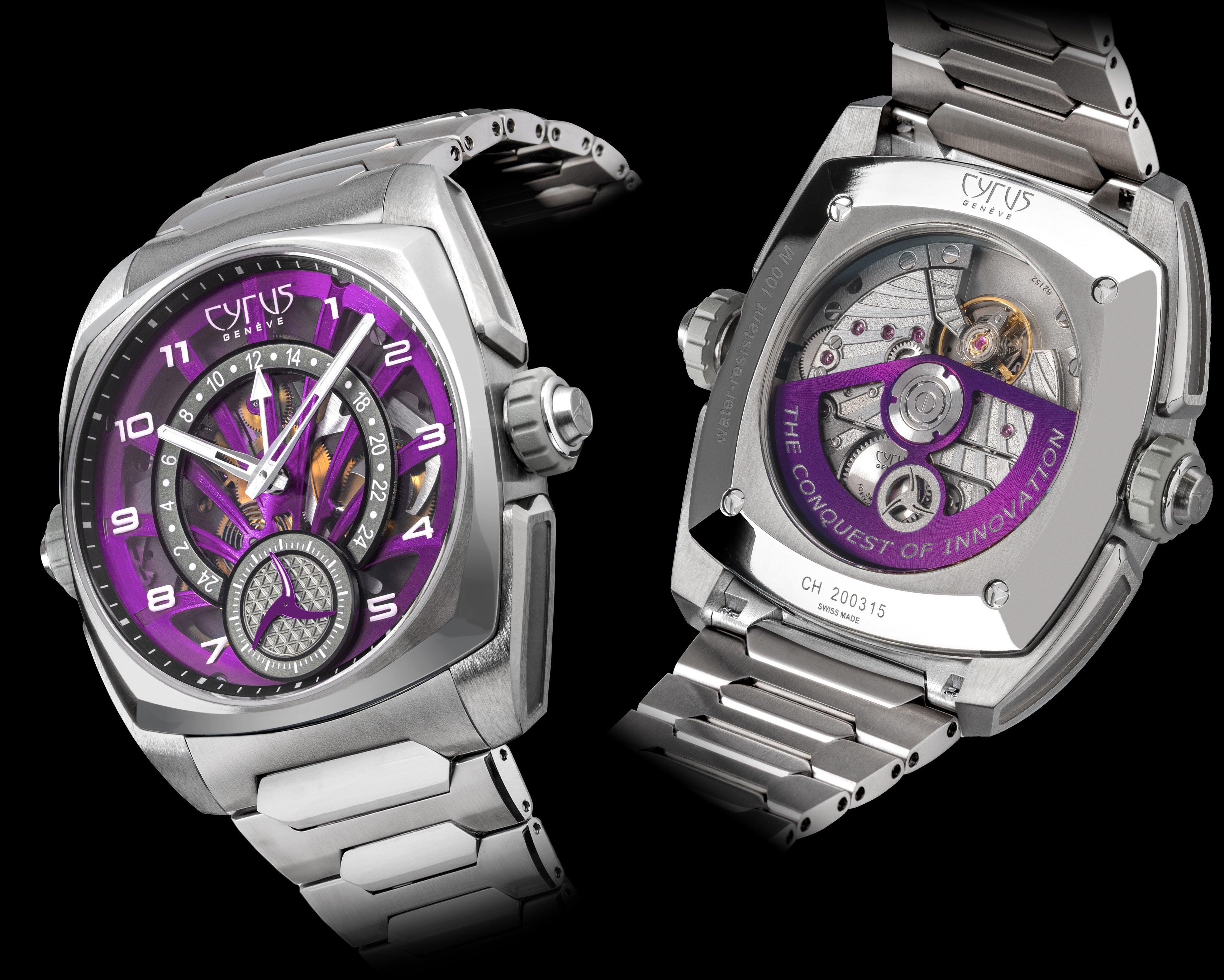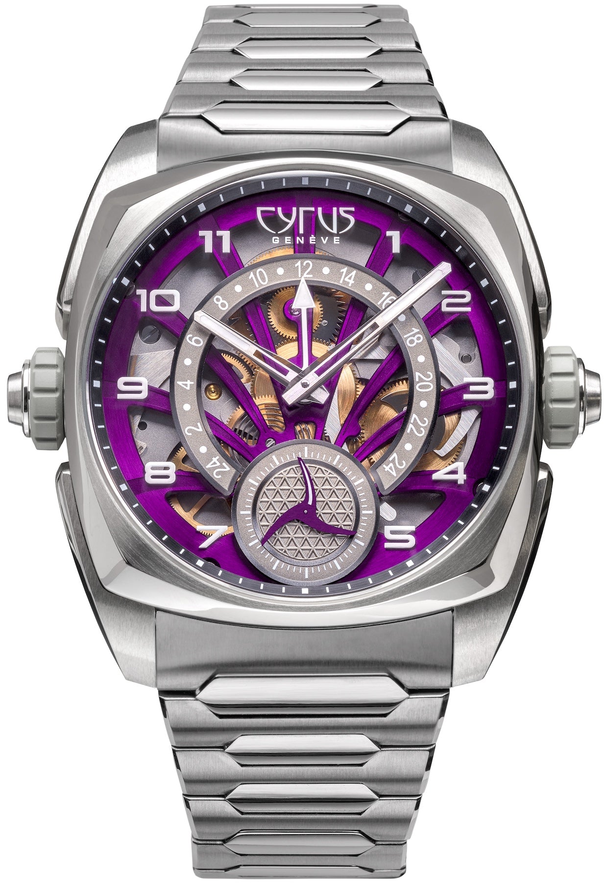 Cyrus Watch Klepcys GMT Titanium Royal Purple Bracelet 539.507.TTM.D. The Klepcys GMT Royal Purple is born, decked out in vivid purple, a colour associated with nobility and originality. Equally noble is the art of watchmaking that Cyrus Genève, with Manufacture based in Le Locle, pursues, creating masterpieces of time in keeping with the high quality standards of Swiss watchmaking and giving them a unique and unconventional stylistic identity.