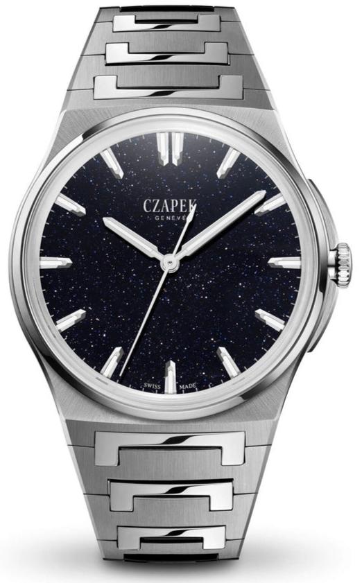 Czapek's Antarctique Aventurine is a unique combination of elegance and zeitgeist. Like a smoking jacket over everyday pants and vice versa, codes are broken and reconciled to better combine and highlight each other. A unique style that allows the wearer stylistic subtlety and, above all, endless freedom of expression. For a wrist under 16.mm, its contained size of 38.5mm, and above all its finesse, will be a guarantee of discreet yet remarkable presence, thanks to its pure flanks and delicate chamfrain running the length of its case, all the way to the end of its bracelet, both present but always in lightness.