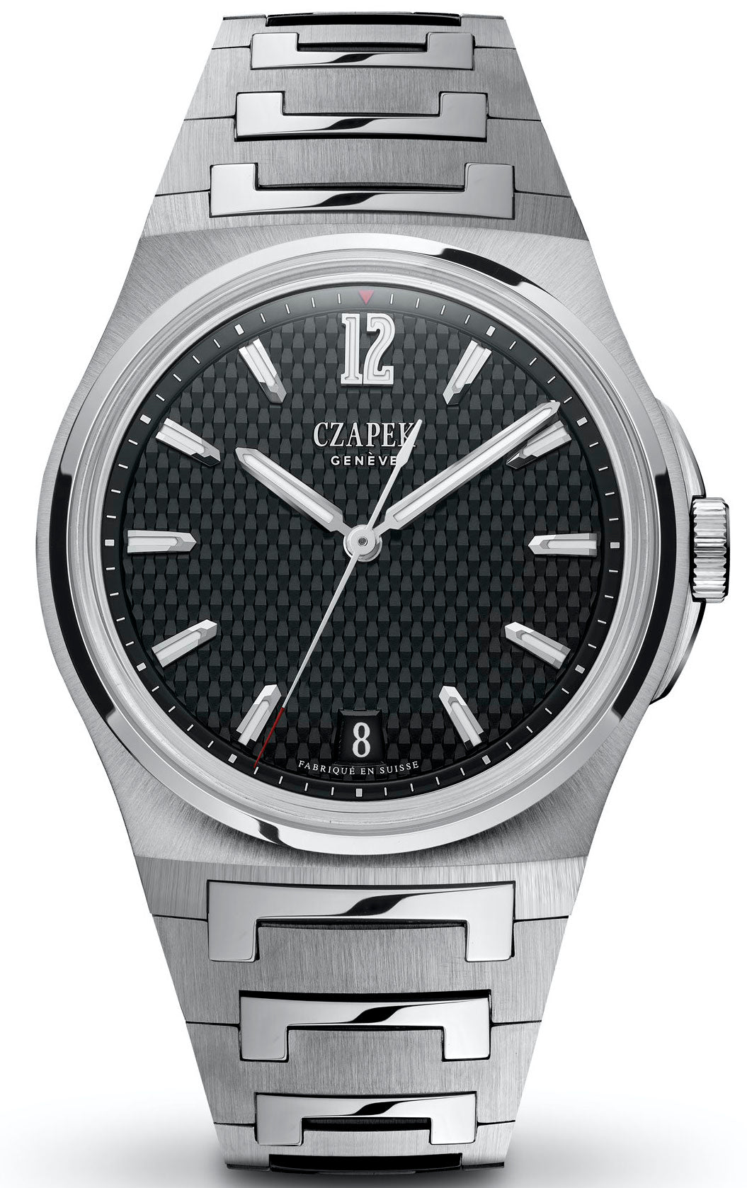 This men’s Czapek Antarctique watch completes its luxury steels sports watch look with an integrated stainless steel bracelet. Ergonomically formed links are executed in a mix of polished and brushed finishes to add character and contrast to the design.