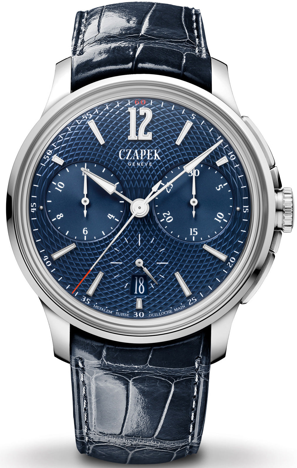 The L’Heure Bleue watch from Czapek’s third watch collection pays homage to traditional watchmaking techniques with a stunning deep blue handcrafted guilloche Resonance dial. The display is adorned with luminous hour markers represented by Arabic numerals and baton indexes, together with arrow shaped central hands. The 3 o’clock location is occupied by a 30 minute counter, whilst the 6 and 9 o’clock locations feature a small seconds counter and a 12 hour totaliser respectively. The date window is also positioned in the southern hemisphere of the dial, protected by a lens of anti glare sapphire crystal glass.