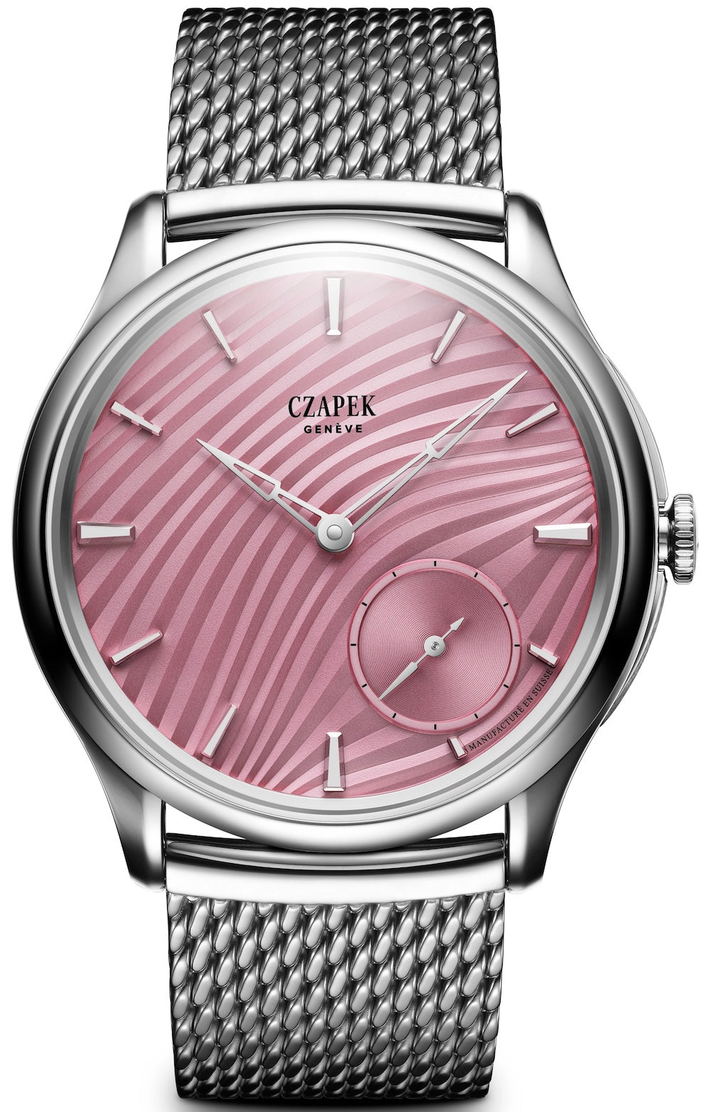 The Promenade collection launched at the 2024 Watches and Wonders event, captivating its audience with designs like this dramatic stamped Plisse dial inspired by textiles. The Czapek and Cie Promenade Plisse Rose watch has a fluid, satin like dial that creates the impression of pleated material, bunched up around a small seconds sub dial at 4.30. This unique stamping technique on the delicate rose petal shades of the dial is the result of the manufacturer's creative work with regular collaborator Metalem. The limited edition timepiece is just one of 18 pieces, appealing to devoted collectors of this special watch manufacturer and its many works of horological.