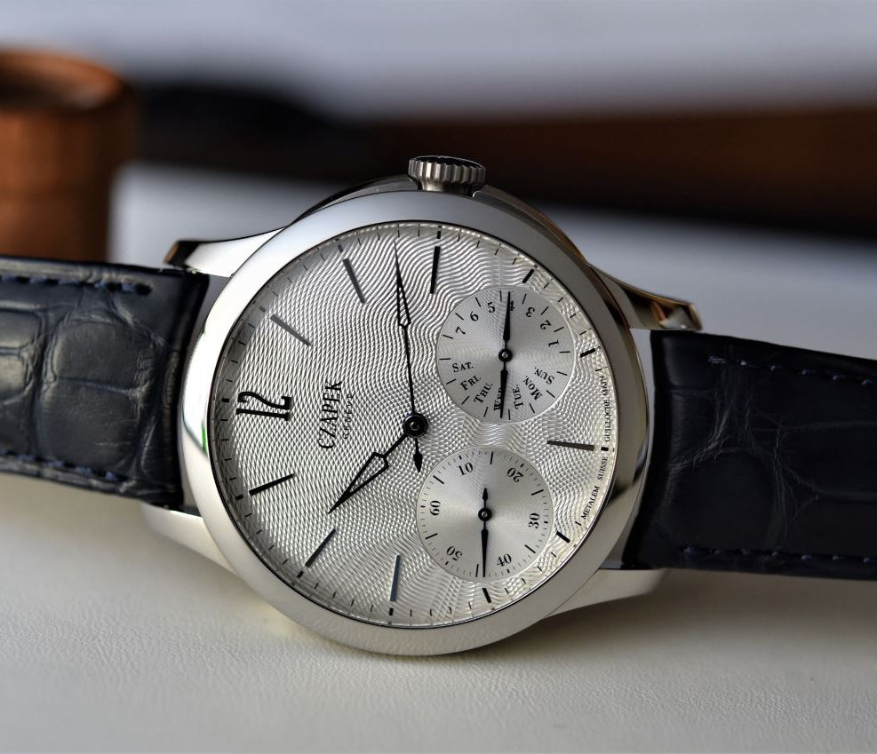 The Quai des Bergues range is a Czapek watch collection that pays homage to the location where Francois Czapek founded the company in Geneva in 1845. The range is distinguishable for its classic cases inspired by the round pocket watch as well as its mysterious XO steel Revolution case, like this men’s Czapek watch, with a mirror polished surface and 50 meters of water resistance. Limited to 10 pieces worldwide, the watch presents the time on a silver handmade bombe guilloche Eaux Vives dial adorned with blued steel arrow shaped central hands, a small second hand at 7:30 o’clock and a weekday and power reserve indication a 4:30.
