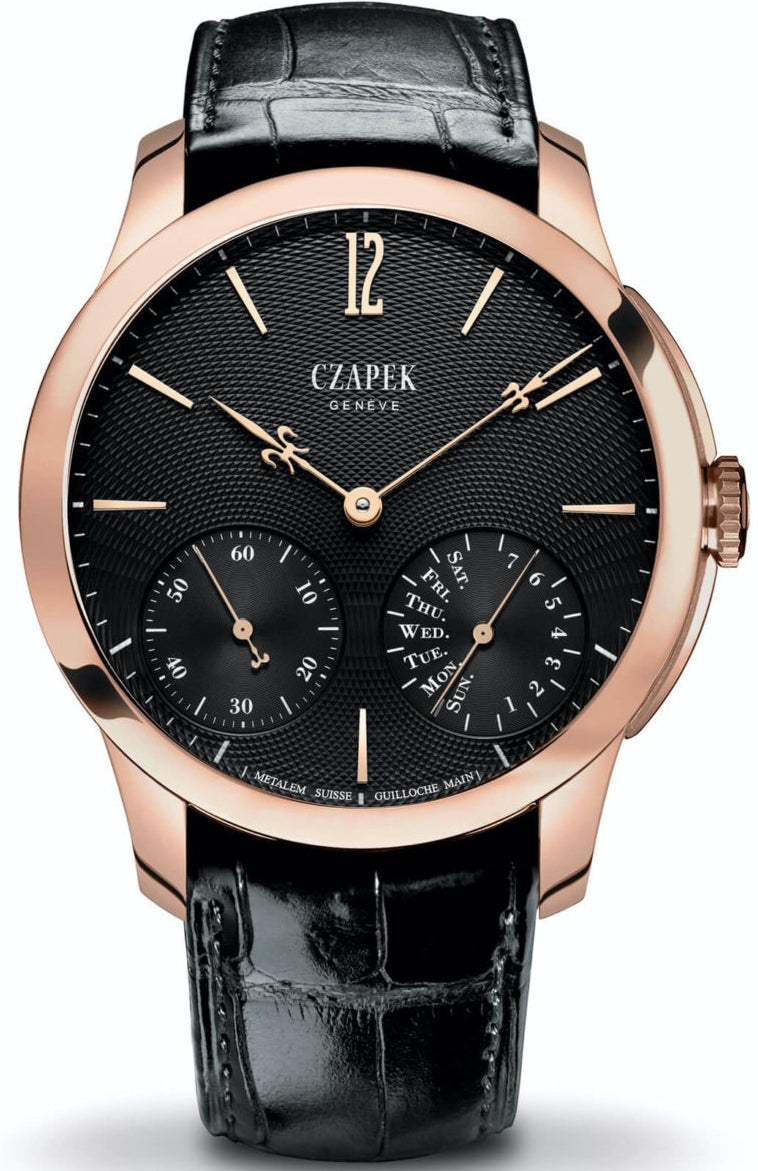 This men’s Czapek Quai des Bergues Guilloche Ricochet Solar Eclipse watch also features rose gold Arabic numerals and stick markers around the hour track, a set of rose gold Fleur de lys hands, a days of the week scale and a small seconds sub-dial at 7 o’clock. The Czapek Quais de Bergues watch is completed on a matte black alligator leather strap with a 5N rose gold buckle and is limited to just 18 pieces worldwide.