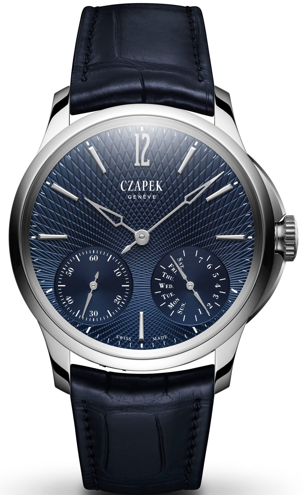 Czapek Watch Quai des Bergues No.17 Double Soleil Deep Blue. One size never truly fits all and with this in mind, Czapek presents its Quai des Bergues model in a 40.5mm case. The steel case retains all of the stylistic signatures of the Quai des Bergues case with a slight refinement of the case-side recesses in order to incorporate the movement (Calibre SXH1) - and a subtle change to the slope of the lugs to ensure a perfect fit on the wrist.