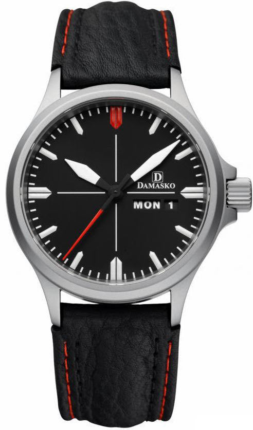 Like most Damasko watches, this Damasko DA 34 Leather Pin watch features a bead blasted stainless steel case that has been hardened and waterproofed to 100 metres while the sapphire crystal glass is extremely scratch resistant and has been coated in an anti reflective treatment making the striking black dial effortless to read. The Damasko DA 34 is powered by a self winding mechanical movement that powers the hour, minute and seconds hand as well as a day date feature at 3 o clock. The timepiece is kept securely on the wrist by a black leather strap detailed with red stitching with a stainless steel pin buckle.