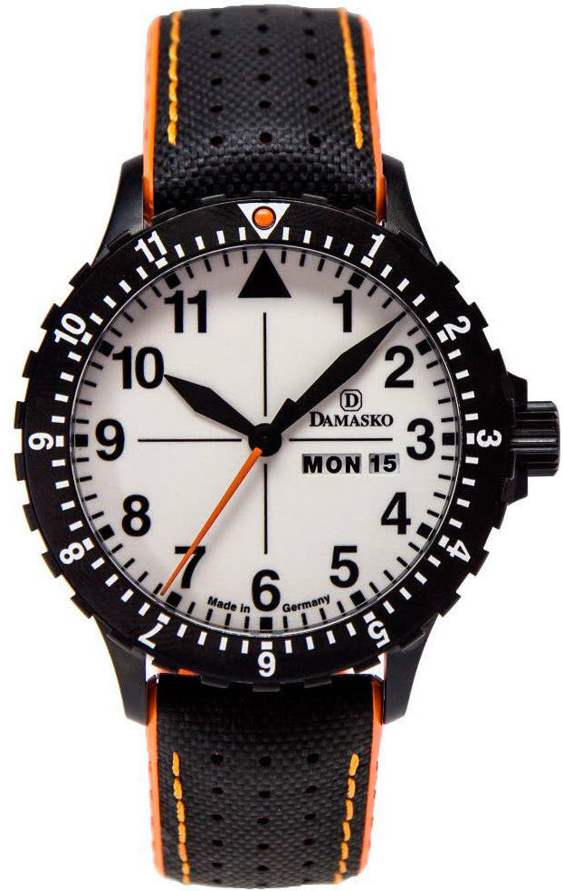 Damasko Watch DA 43 Black Robby Black Orange. The contrast is clearly paramount here. All stainless steel components are provided with the patented and scratch resistant coating, the dial shines in white, refined through the more energetic color orange and uncountable technical features the timekeeper will get a certain something. Enabling the best readability of the also entirely hardened bezel, the numbers are painted with white color and a white triangle with an orange Bilight as a main feature.