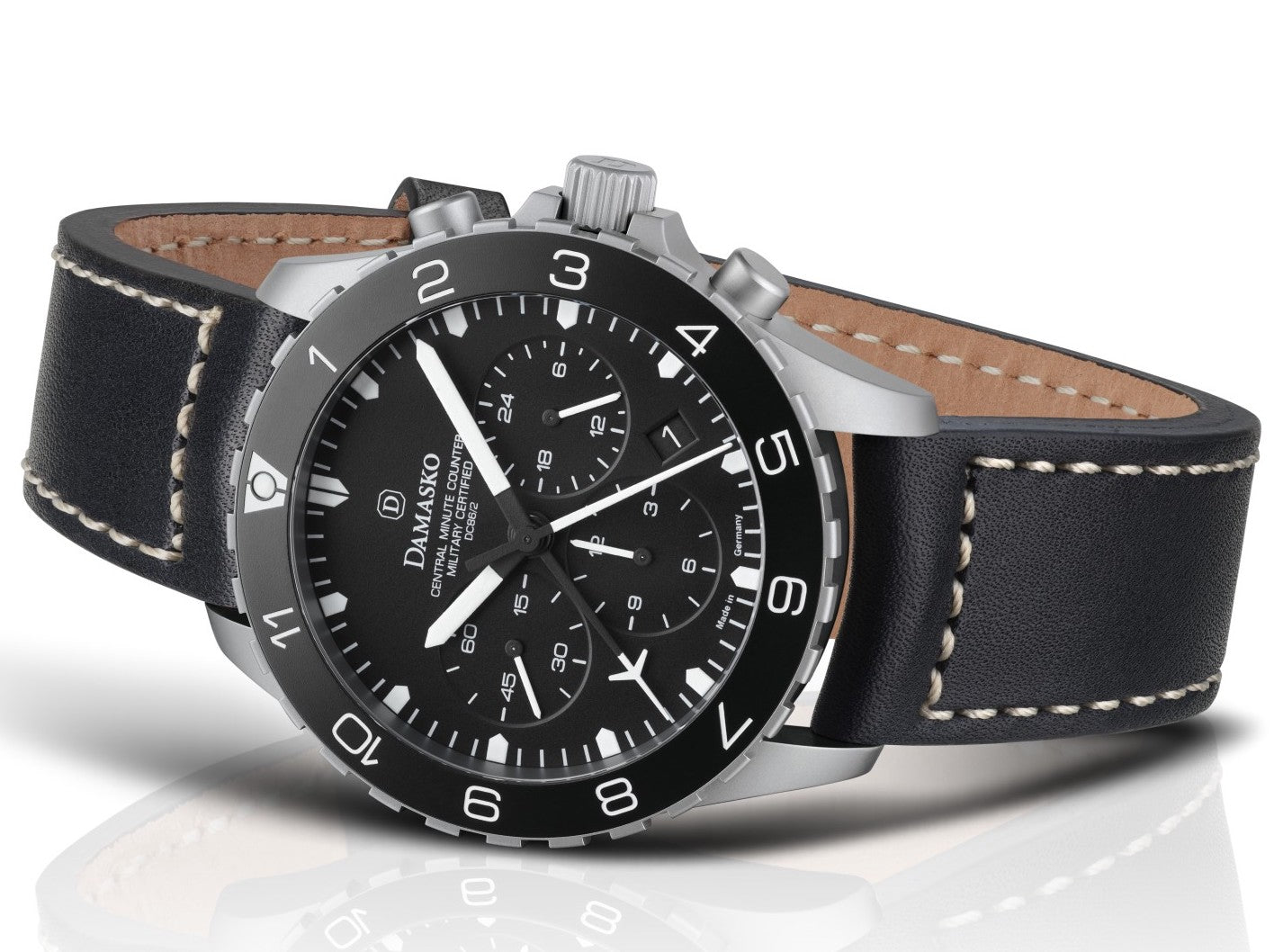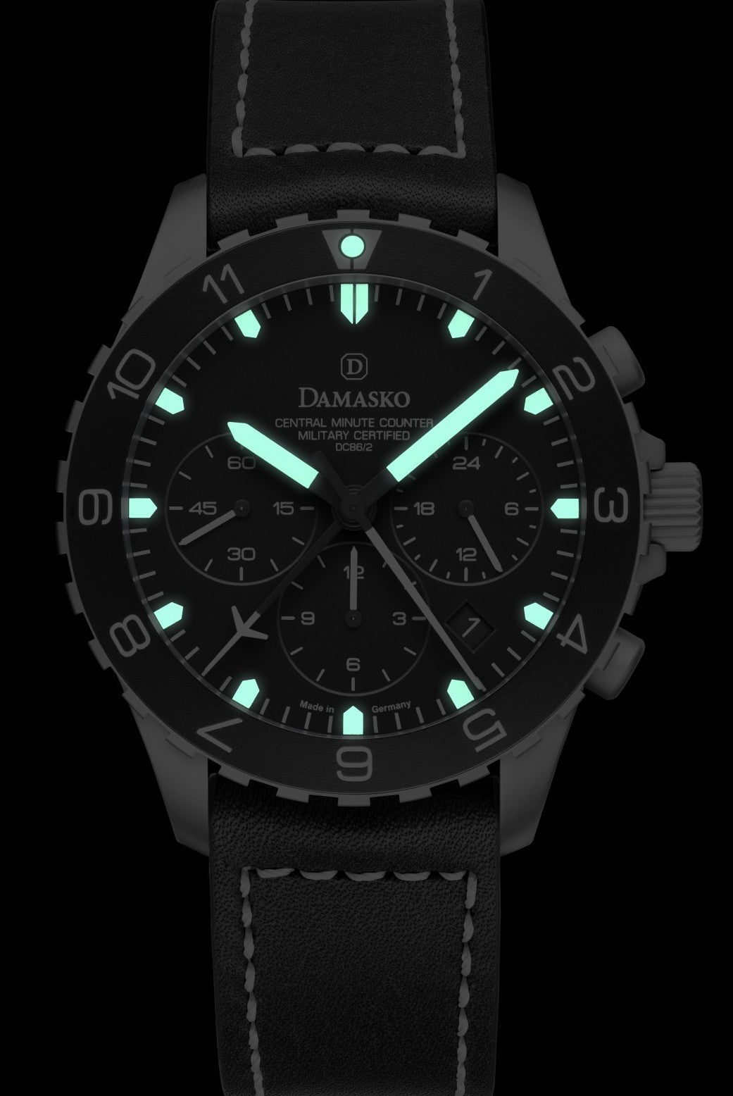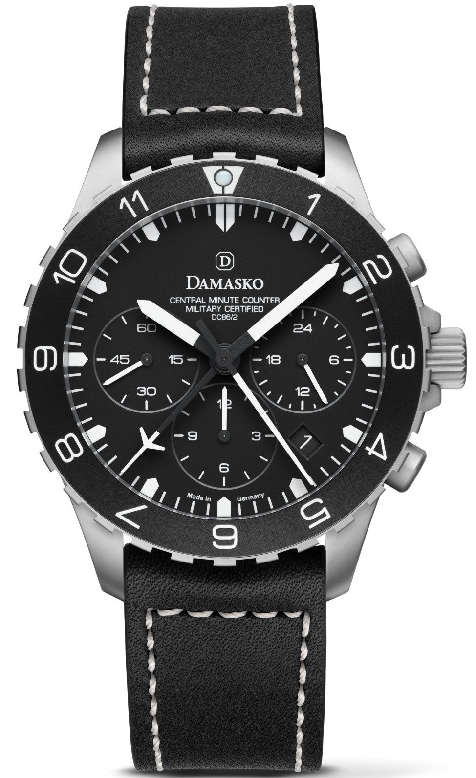 Damasko Watch DC86/2 Leather DC86/2 LEATHER. A chronograph line based on the DAMASKO chronograph calibre C51 is heralded with the DC8X series. A criterion of this development is to increase the readability of the chronograph functions significantly. Here, the historic Lemania 5100 movement acted as a role model. The main focus of the new line is on the technical realisation of a springing 60 stop-minute display from the centre. Thanks to this new, patented design, it is possible to record stop times even more easily, accurately and quickly. It offers two key advantages: 60 minutes, instead of the usual 30 minutes, are counted in a hand revolution and the allocated minute-stop scale can be seen across the full face diameter.
