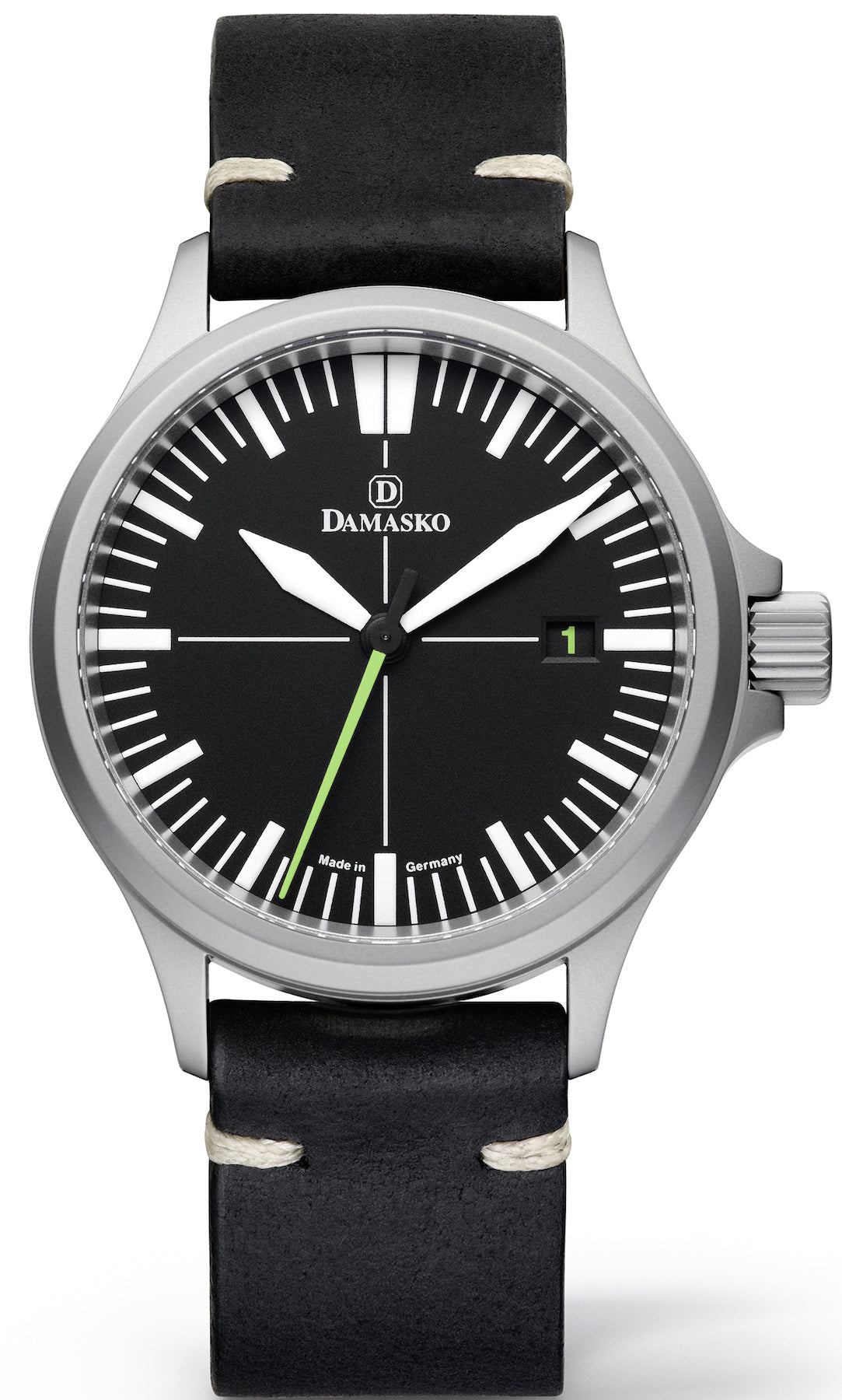 Damasko Watch DS 30 Green Leather Pin DS 30 Green Leather Pin. This model is part of the basic equipment of every wardrobe. Whether for business look or leisure outfit, no other version is so versatile in combination with new colorful leather straps. The contrast between the black dial and the white special colored hands and indices ensure a clear design language. Covered by a bead blasted case made of submarine steel. This material is characterized by extraordinary strength, highest non magnetic quality and unique corrosion resistance.