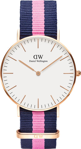 Daniel Wellington Watch Classic 36 Winchester DW00100033. Purposely designed to stand out in a subtle yet playful manner, the Classic Winchester is a fan favorite. The classic blue stripes, divided by a single line of bright pink, is the perfect mix of elegance and exuberance. The rose gold dial gives the timepiece a polished finish.