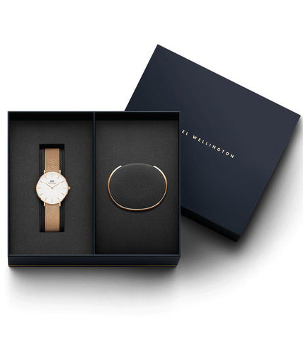 Daniel Wellington Watch Classic Petite Melrose Set DW00500204. Classic Petite Melrose features an eggshell white dial and an undeniably elegant rose gold mesh strap. Create a perfect match with the minimalist bracelet Classic Cuff.