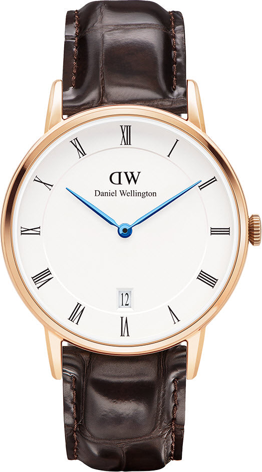 Daniel Wellington Watch Dapper 34 York DW00100093. The Dapper York is an elegant and unpretentious watch that goes wherever the day takes you. The 34mm timepiece is available with a silver or rose gold case, which has been paired with the dark brown, York leather strap in crocodile texture. With sophisticated details such as deep blue hands, Roman numerals and a date display, the Dapper York is a great addition to any wardrobe, and goes with all styles and ages.