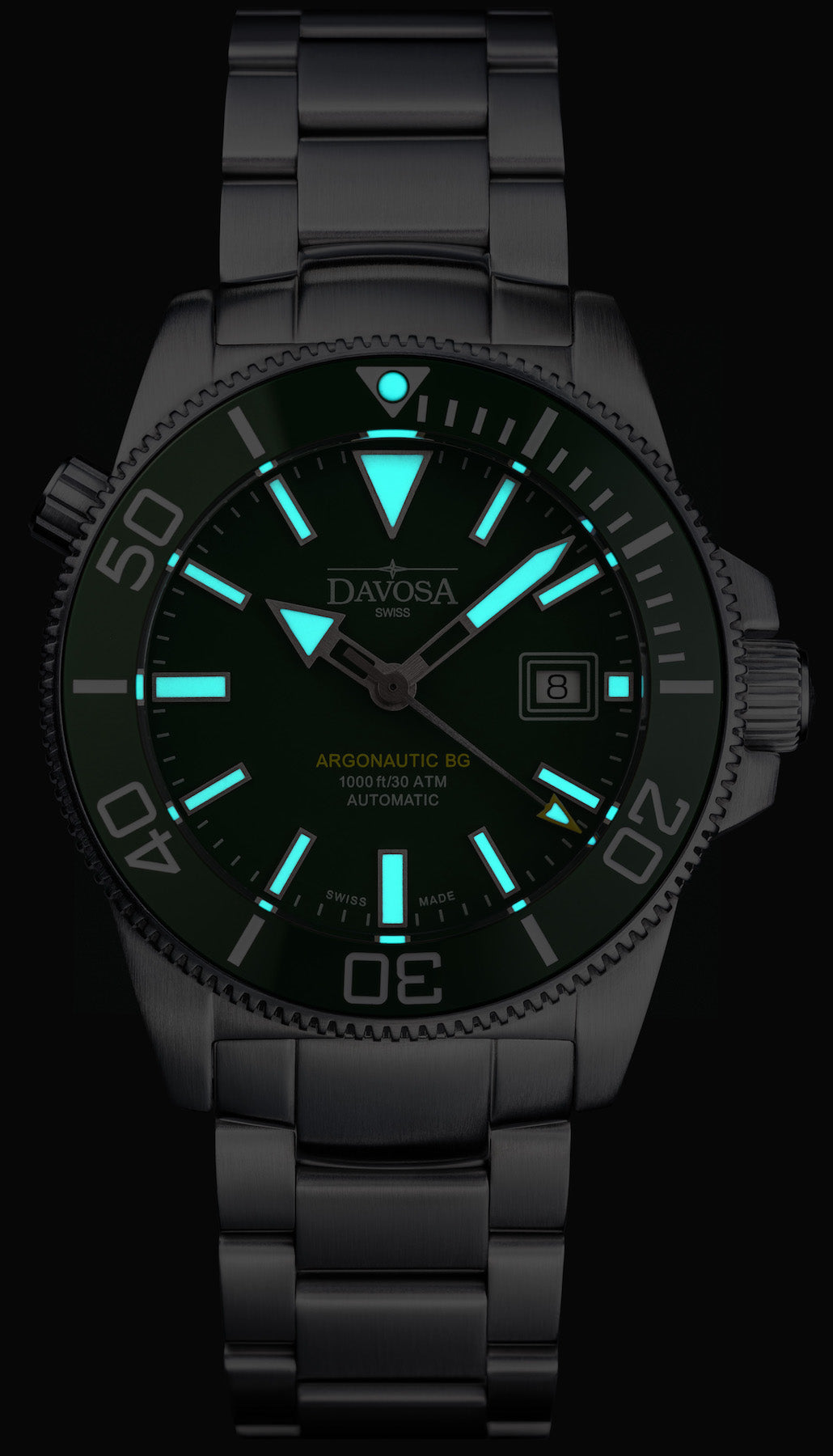 Davosa Watch Argonautic BG Automatic 16152870. The Swiss DAV 3021 automatic movement in its screwed stainless steel case keeps perfect time on the way down. Scratch-resistant, anti-glare sapphire crystal guarantees a clear view of the tidily designed dial with its 15-minute scale on the bezel inlay to provide orientation in an emergency ascent. And thanks to the extension to the stainless steel strap with a safety clasp, the DAVOSA Argonautic BG Automatic can be easily worn on top of a wetsuit.