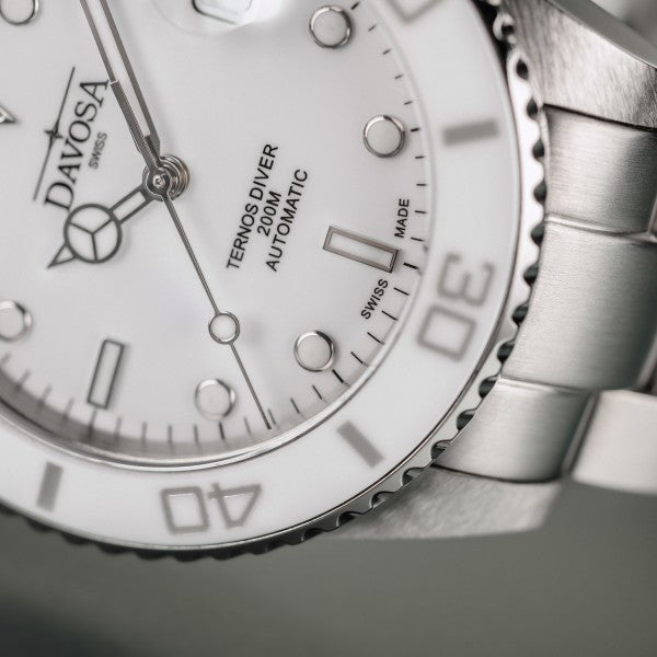 Davosa Watch Ternos Diver Lady White 16619510. The Ternos Ceramic series is one of DAVOSAs most popular models. The series name derives from the Latin term for everlasting and the choice of name is no coincidence. Its components include a high tech, ceramic bezel, scratch resistant, transparent, anti reflective sapphire crystal, a meticulously crafted stainless steel case capable of withstanding pressures of 20 ATM, a precise Swiss DAV 3021 automatic movement, ensuring long lasting, functional reliability. The design is very subtle for a sporty divers watch and truly deserves the classic timeless attribute, the Ternos not only cuts a fine figure over a wetsuit, but looks stylish in combination with a single breasted business suit.