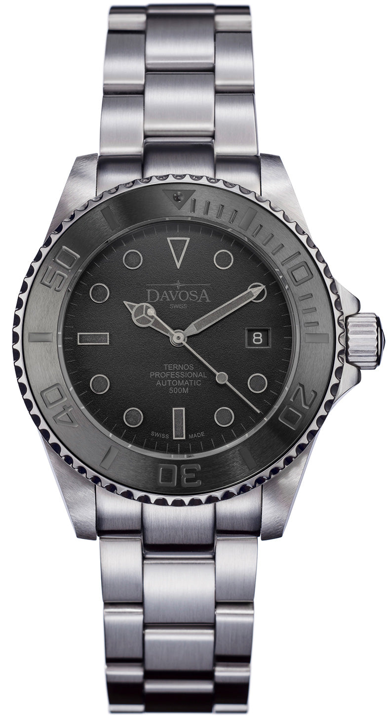 Davosa Watch Ternos Pro Black Suit Limited Edition 16158355. The Davosa Watches Black Suit proves that black can be multifaceted, a carefully coordinated combination of different textures makes all the difference here. Indices and hands with stained surfaces and a filling of black Super Luminova create a subtle contrast against the structured, matt black dial. Despite their black colour, the glossy figures of the minute scale are easily readable against the circular, matted bezel inlay of high tech ceramic. The DAVOSA Ternos Pro Black Suit is completed by a DLC plated or pure stainless steel case, depending on the version, and a metal strap with screwed links, safety buckle and a diving extension.