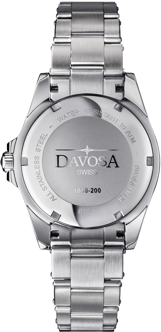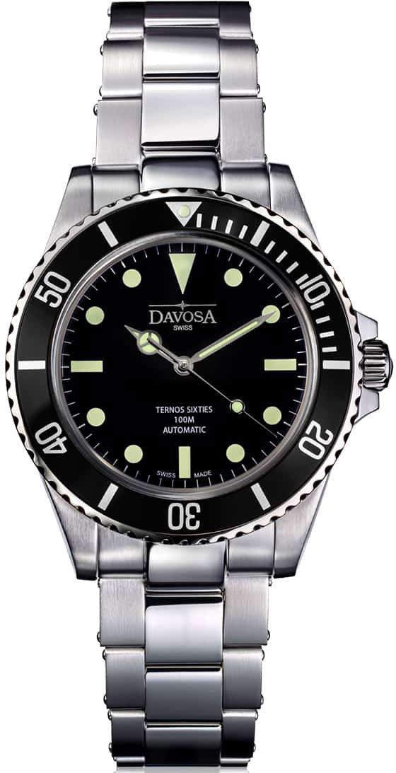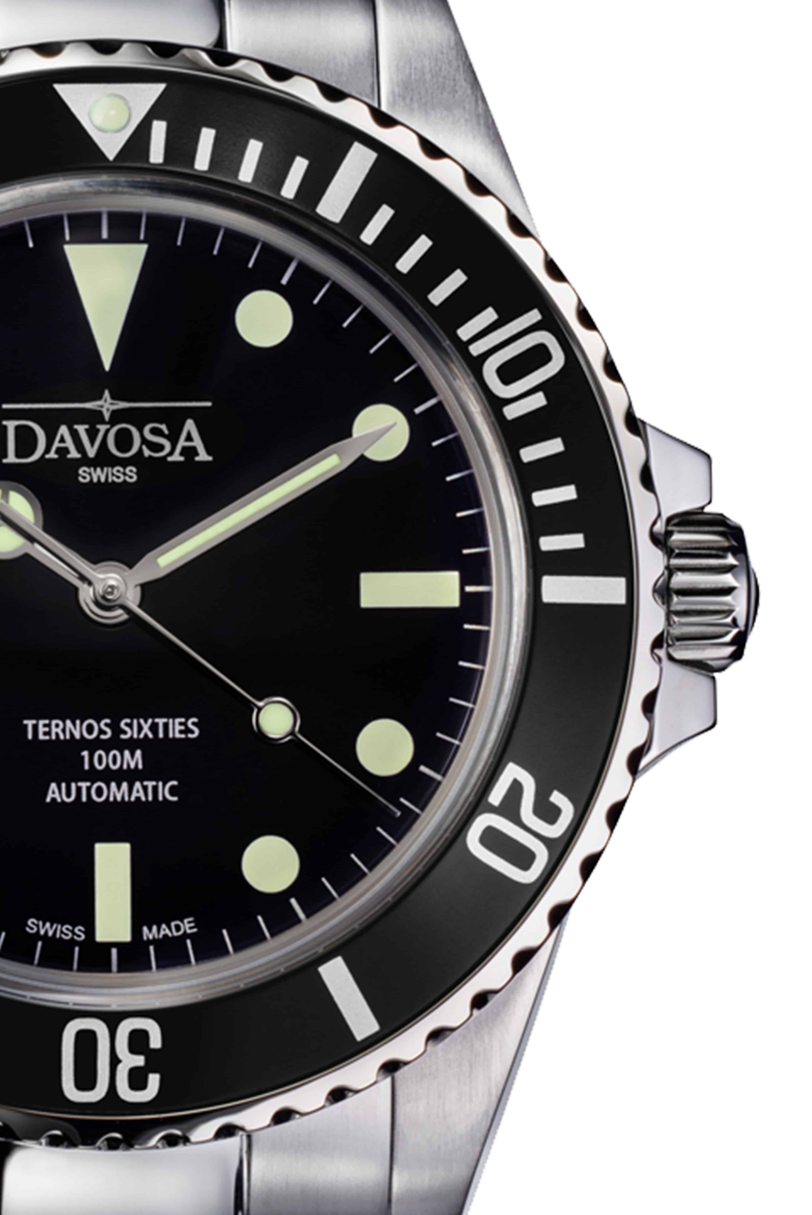Davosa Watch Ternos Sixties 16152550. Davosa watches are reviving the spirit of the 1960s with the Sixties edition of its popular Ternos divers watch. In this edition, the Swiss manufacturer of high quality mechanical watches focuses not only on materials and design, but also on how the watch feels on the wrist, in a bid to revive the carefree decade during which freedom in lifestyle and fashion became so important. The case of the Ternos Sixties is made entirely from corrosion resistant 316L stainless steel. It is shaped like a lens, and fits snugly onto the wrist. The screw down back domes several millimetres, concealing a robust Swiss DAV 3021 automatic movement. The dial is protected by a domed glass, a typical characteristic of 1960s watch design. A uni rotational, aluminium bezel underscores the vintage look.
