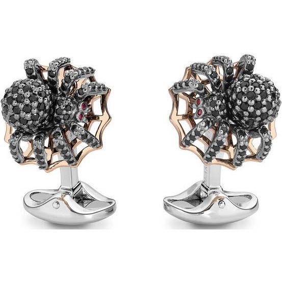 Stunningly creepy, these sterling silver spider cufflinks are a great talking point. Semi-precious black spinel spiders with ruby eyes and a rose gold plated web, these sterling silver cufflinks are perfect for impresarios.