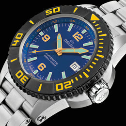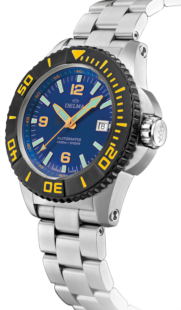 Delma Watch Blue Shark III Azores 54701.700.6.048. Delma watches automatic divers watch with helium valve and unidirectional bezel. All stainless steel or two tone black DLC. Water resistant to 4000 meters.