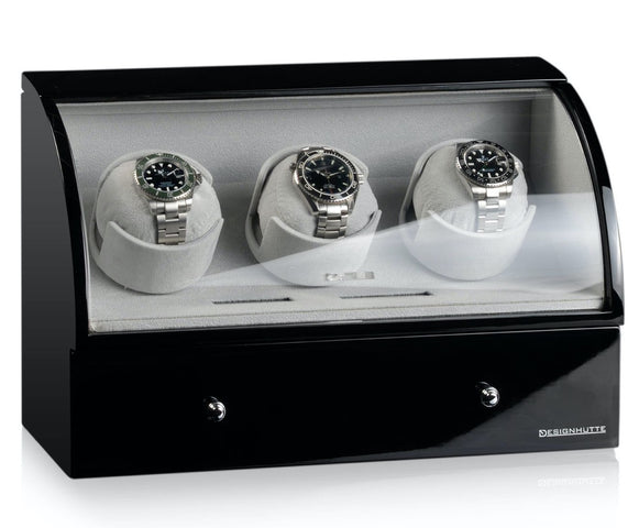 Designhuette Watch Winder Basel 3 Black 70005-25. Designhuette has impressed watch lovers at home and abroad with high quality watch winders and watch boxes. Through their investment in modern production techniques, new and innovative products are constantly being developed and brought into being. The sporty and elegant design as well as the excellent price performance ratio of this brand are just two of the reasons to make a decision in favour of a Designhuette watch winder.