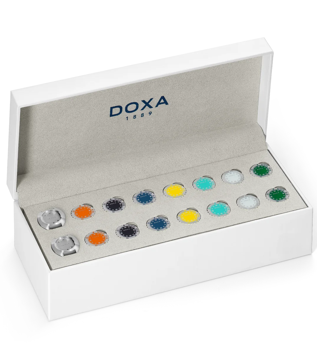 Doxa Cufflinks SUB Set CUF.10-SET. DOXA launches its first line of accessories by presenting a collection of cufflinks - A refined alliance between masculine elegance and an adventurous spirit. This collection of cufflinks, inspired by the design of the famous SUB watches, is making its debut in the brand's permanent catalog.
