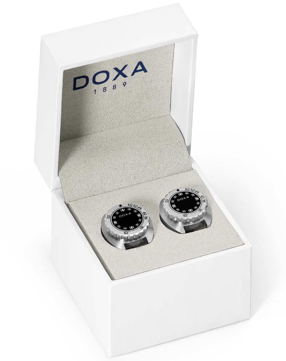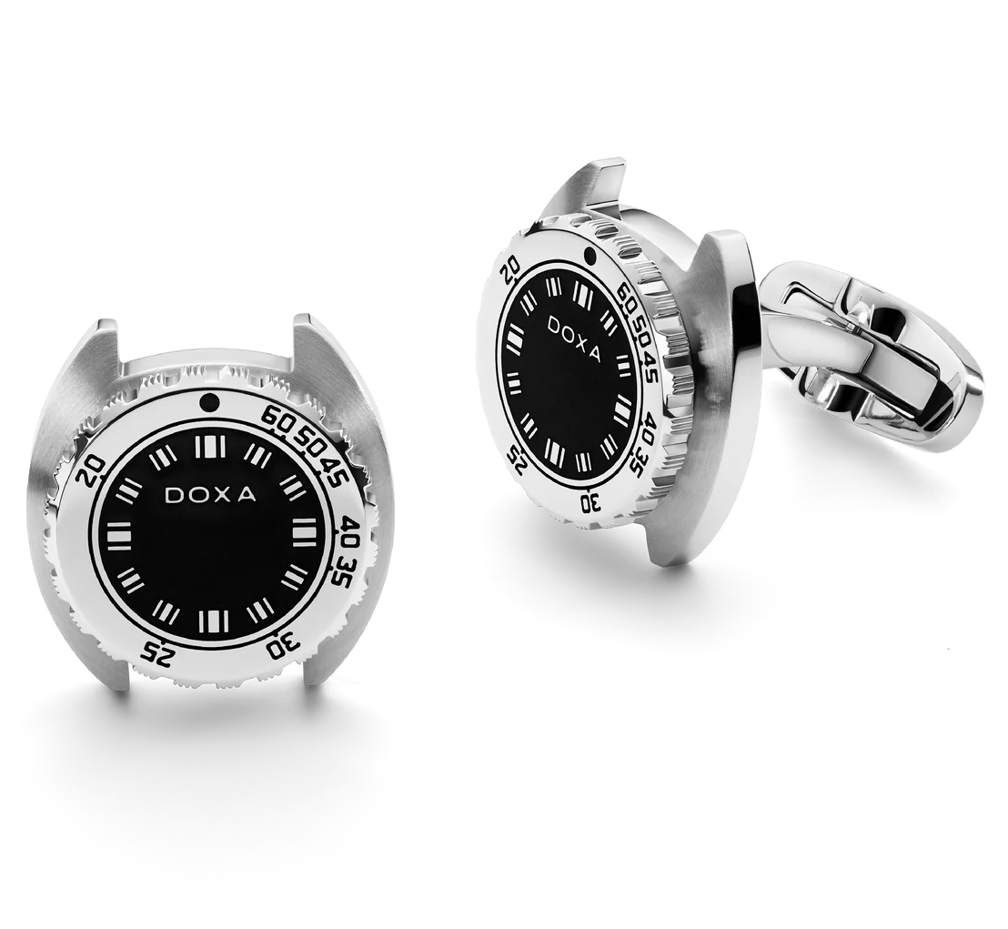 Doxa Cufflinks SUB Sharkhunter Black CUF.10.101. DOXA launches its first line of accessories by presenting a collection of cufflinks - A refined alliance between masculine elegance and an adventurous spirit. This collection of cufflinks, inspired by the design of the famous SUB watches, is making its debut in the brand's permanent catalog.