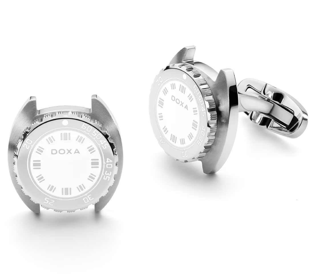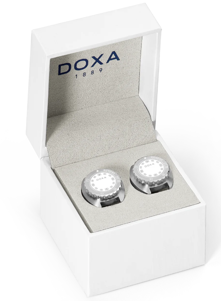Doxa Cufflinks SUB Whitepearl White CUF.10.011. DOXA launches its first line of accessories by presenting a collection of cufflinks - A refined alliance between masculine elegance and an adventurous spirit. This collection of cufflinks, inspired by the design of the famous SUB watches, is making its debut in the brand's permanent catalog.
