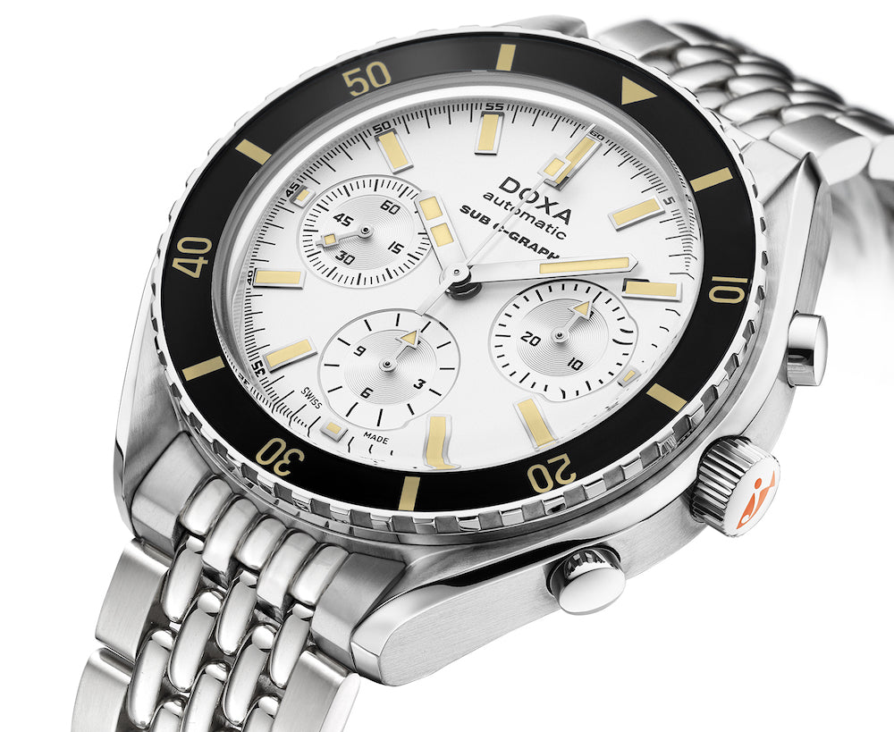 Doxa Watch SUB 200 C-Graph Searambler Bracelet 798.10.021.10. The Doxa watches SUB 200 C-Graph. The case, made of highest quality 316L stainless steel has a diameter of 45mm and features a unidirectional rotating bezel. The screw down crown further ensures water resistance to 200m. Under the dome shaped, scratch resistant sapphire glass box crystal, all dive related indications on the dial are treated with a Super LumiNova luminescent coating to ensure optimum legibility under low visibility conditions. The Swiss automatic movement offers a power reserve of approximately 48 hours.