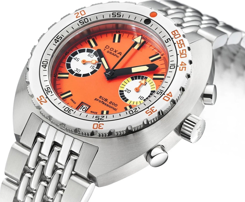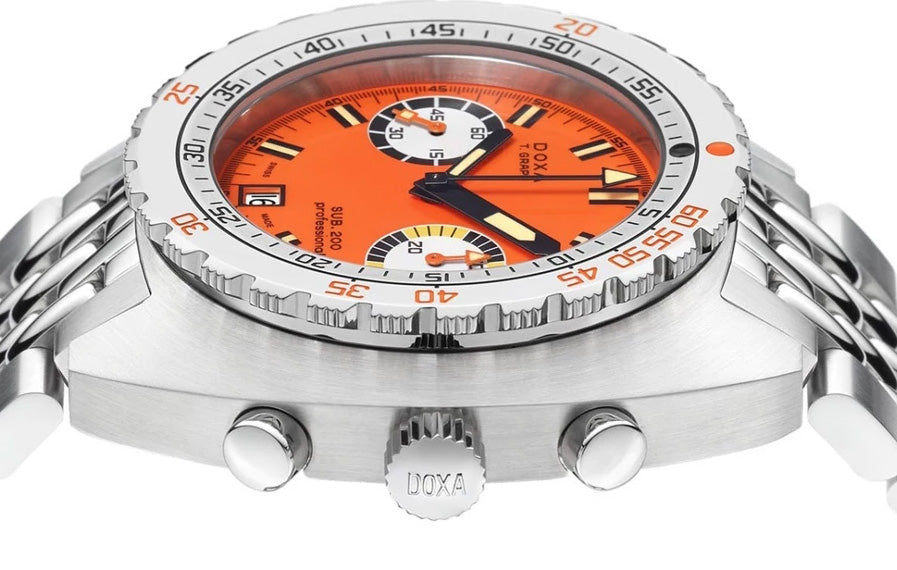 Doxa Watch SUB 200 T.GRAPH Professional Limited Edition Bracelet 805.10.351.10. In 1969, the SUB concept is further refined in the form of the DOXA SUB 200 T.GRAPH, which even today still counts as a reference in the field of the most emblematic diving watches in watchmaking history. And the legend continues. 50 years later, DOXA presents a reinterpretation of its iconic model. Following a first limited edition in 18K gold, DOXA unveils the SUB 200 T.GRAPH in a new stainless steel limited series. With a diameter of 43mm, the SUB 200 T.GRAPH is topped by a scratch resistant sapphire crystal with an anti reflective coating. In addition to being water resistant to 20 ATM, equivalent to a depth of about 200 meters, the watch also features the famous patented unidirectional rotating bezel with the dual indication of dive time in minutes and depth in meters to calculate the dive time without decompression stops. Just like the original model, the legendary face finished in semi matte orange features two counters, one at 9 o clock indicating the seconds, and the other at 3 o clock indicating the chronographs 30 minutes. The baton type hands and the insert on the chronographs seconds hand are all filled with SuperLuminova beige Light Old Radium. This limited steel edition is equipped with historical 7734 VALJOUX movements. These original calibers, dating back 30 years, have been carefully preserved by the Swiss family Jenny, who took over ownership of the DOXA brand two decades ago. Each movement has of course been completely revised and made absolutely reliable prior to fitting. The famous DOXA grains of rice bracelet, also crafted from 316L steel and featuring a folding clasp with diving extension and the DOXA fish symbol, rounds off this purpose designed classic.