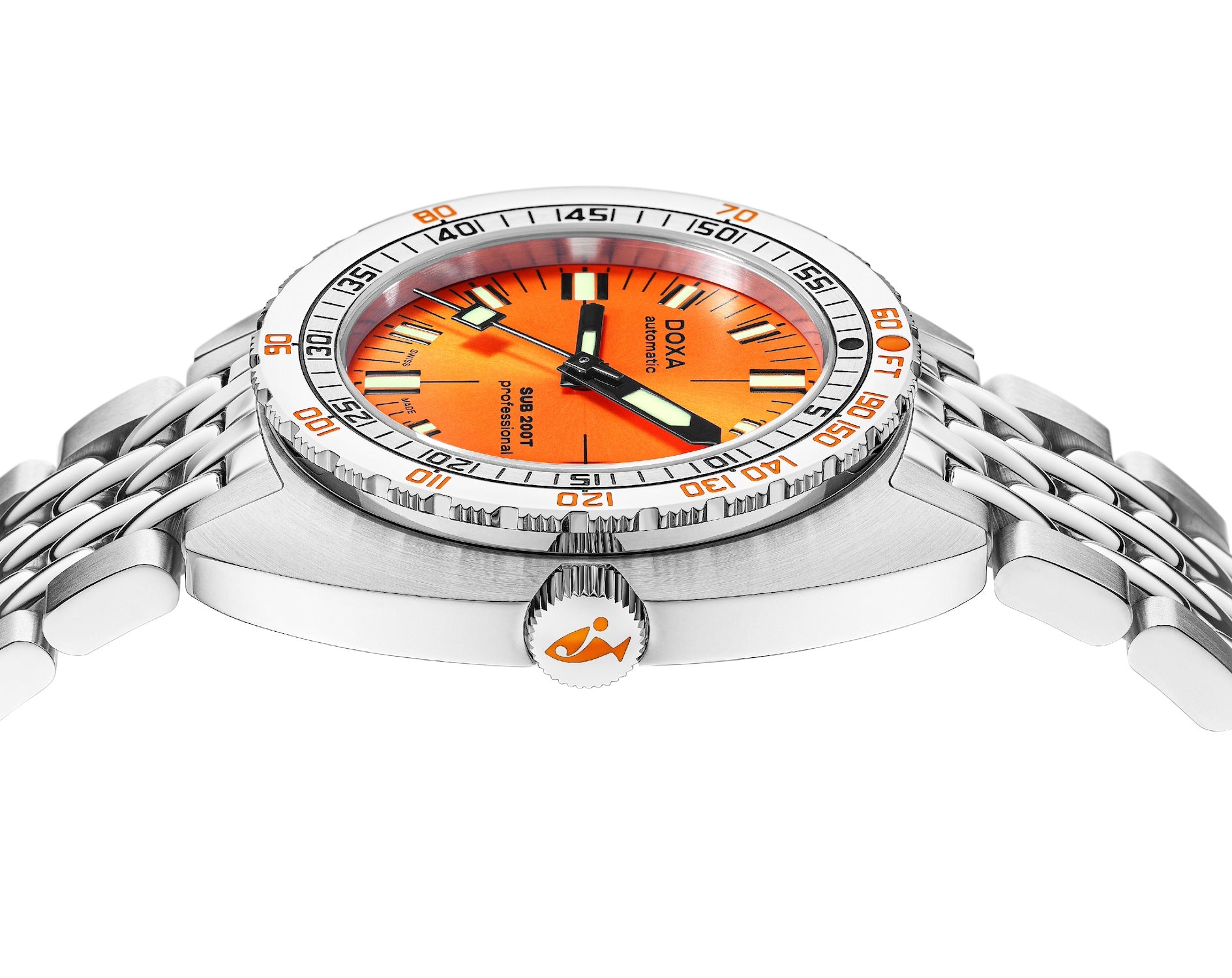 Doxa Watch SUB 200T Professional Sunray Bracelet 804.10.351S.10. The Doxa watches SUB 200T skillfully retains all of the original SUB’s DNA while embracing modern style and sophistication with its smaller diameter. In reworking the spatial volumes inside the case to bring it down to an elegant 39mm diameter and a more wearable thickness of 10.70 mm, DOXA has also tweaked the dial design to achieve a more contemporary visual presence on the wrist.