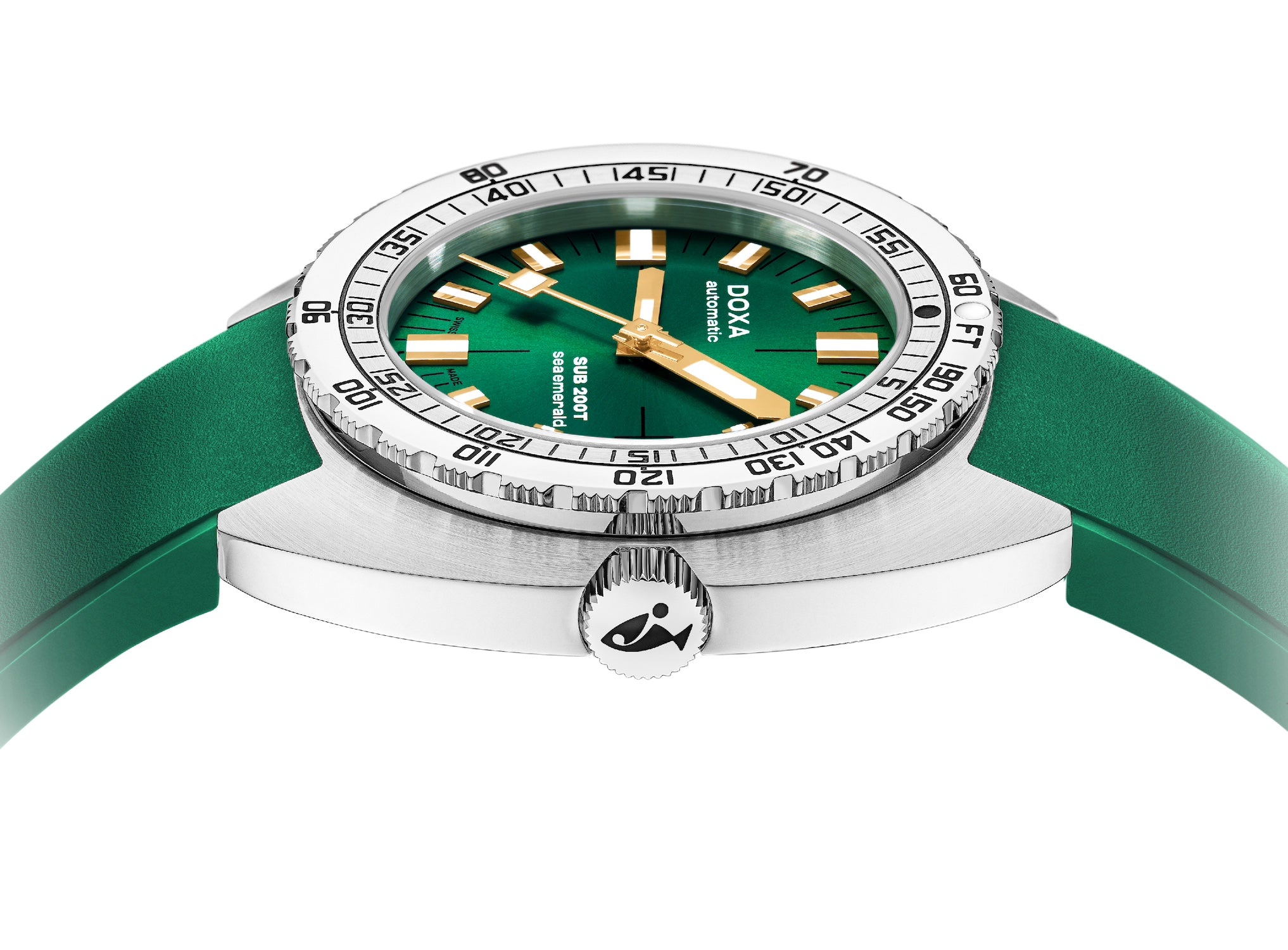 Doxa Watch SUB 200T Sea Emerald Sunray 804.10.131S.26. The Doxa watches SUB 200T skillfully retains all of the original SUB’s DNA while embracing modern style and sophistication with its smaller diameter. In reworking the spatial volumes inside the case to bring it down to an elegant 39mm diameter and a more wearable thickness of 10.70 mm, DOXA has also tweaked the dial design to achieve a more contemporary visual presence on the wrist.