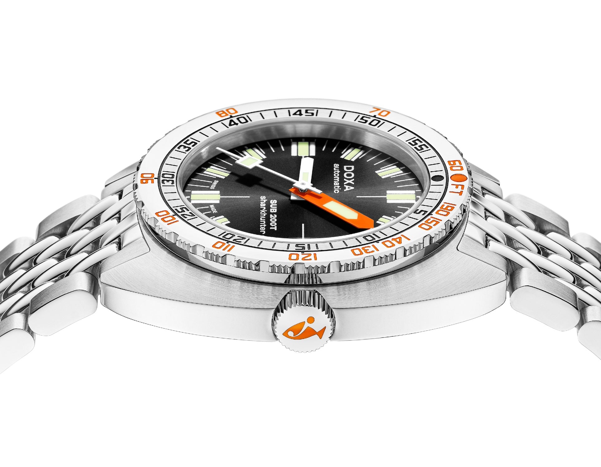 Doxa Watch SUB 200T Sharkhunter Sunray Bracelet 804.10.101S.10. The Doxa watches SUB 200T skillfully retains all of the original SUB’s DNA while embracing modern style and sophistication with its smaller diameter. In reworking the spatial volumes inside the case to bring it down to an elegant 39mm diameter and a more wearable thickness of 10.70 mm, DOXA has also tweaked the dial design to achieve a more contemporary visual presence on the wrist.