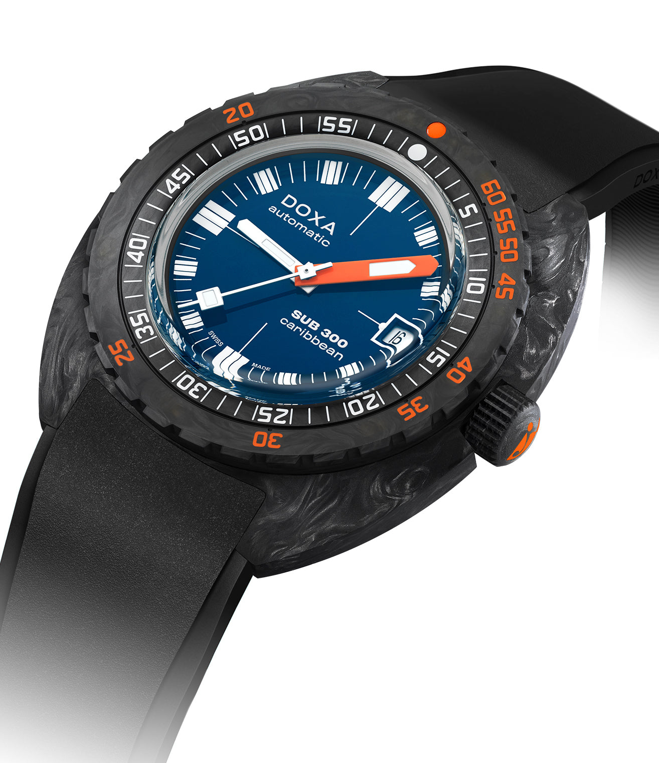 Doxa Watch SUB 300 Carbon COSC Caribbean Rubber. 822.70.201.20. The world over and across generations of divers and adventurers. DOXA SUB watches stands for the benchmark for diving watches, greatly contributing to the safety of professional and sports divers thanks to the many technical details they introduced.