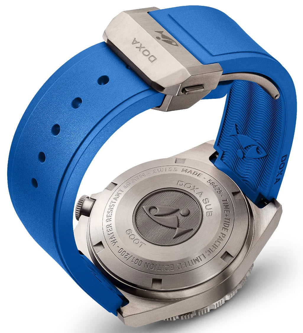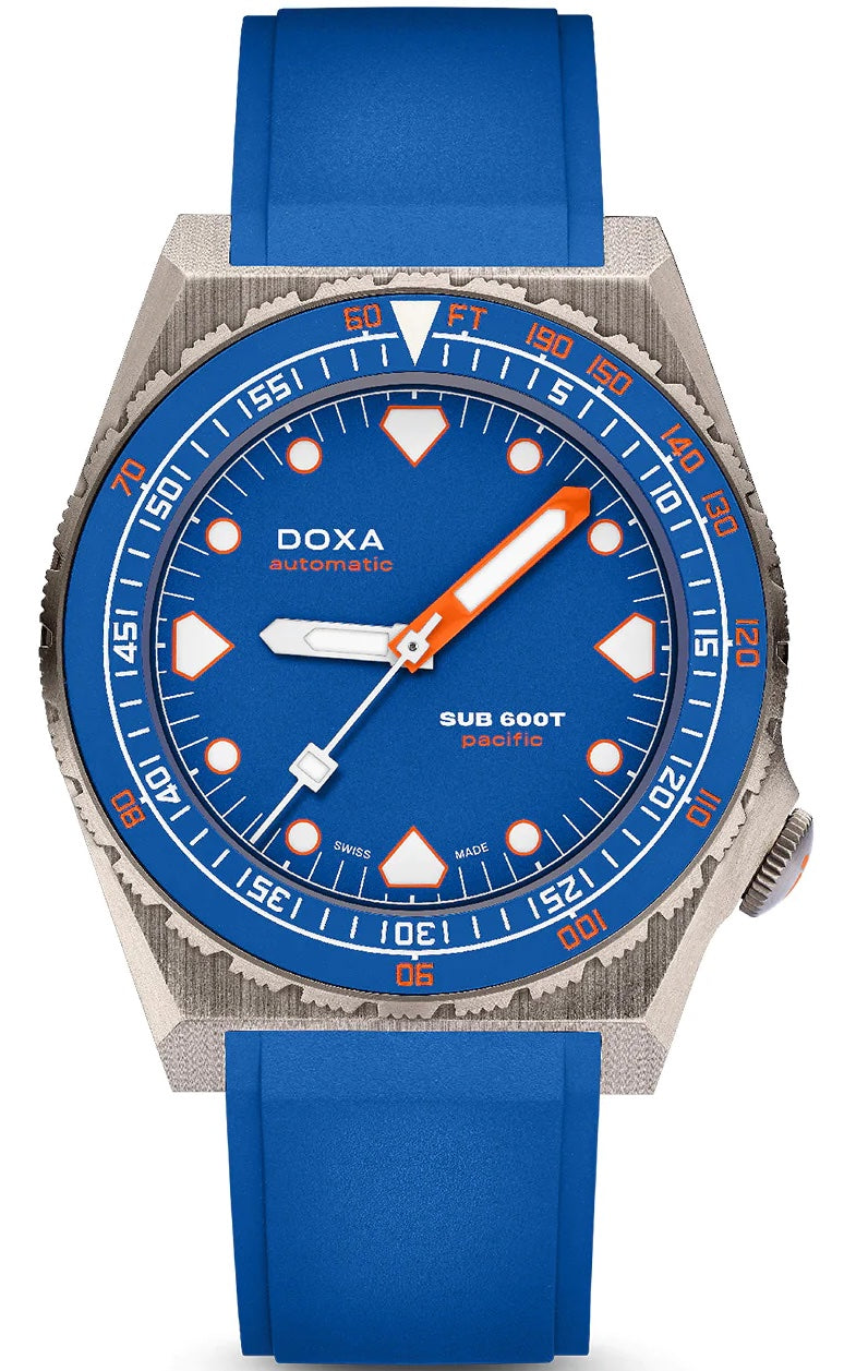 Doxa Watch SUB 600T Pacific Limited Edition Sub 600T Pacific. First introduced in the 80s, the SUB 600T joined previous DOXA dive models as a legend in its own time. Now, 40 years later, it is reborn in a brushed titanium case with ceramic bezel inlay bezel and comes with a dial colour in a shade of blue matched to the Pacific Ocean. The SUB 600T ‘pacific’ will be limited to 200 pieces and is proudly released in collaboration with Time+Tide, DOXA’s partner in Australia.