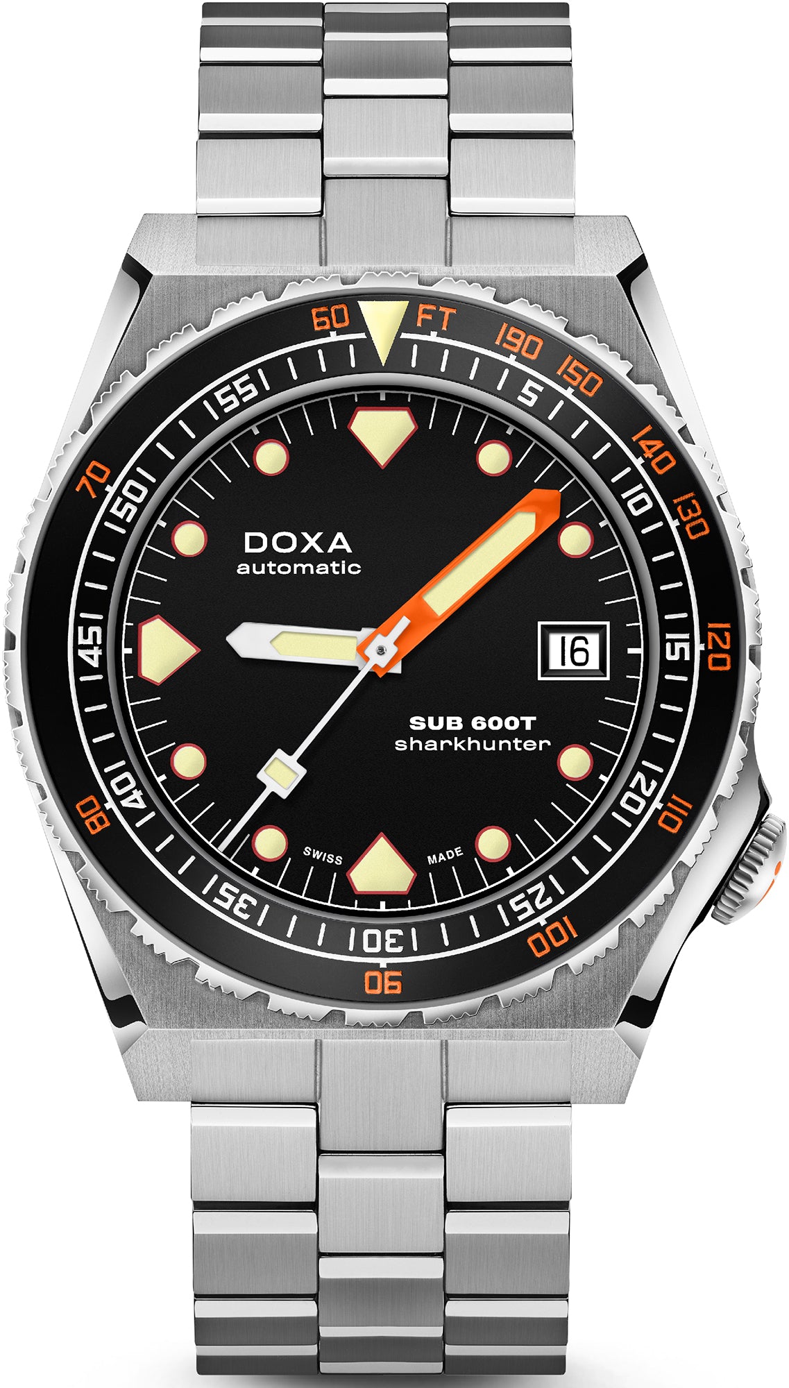 Doxa Watch SUB 600T Sharkhunter Bracelet 861.10.101.10. Doxa watches first came to life among the Jura hills of Switzerland. Inspired by the experiences within the watchmaking industry, Ducommun established the Doxa brand in 1889 which quickly became renowned for its innovative and unusual timepieces. Most famously known are the Doxa Sub watches which were the first watches in the world designed especially for sports diving, a timepiece that was considered a certified piece of divers equipment remains completely reliable in the water.