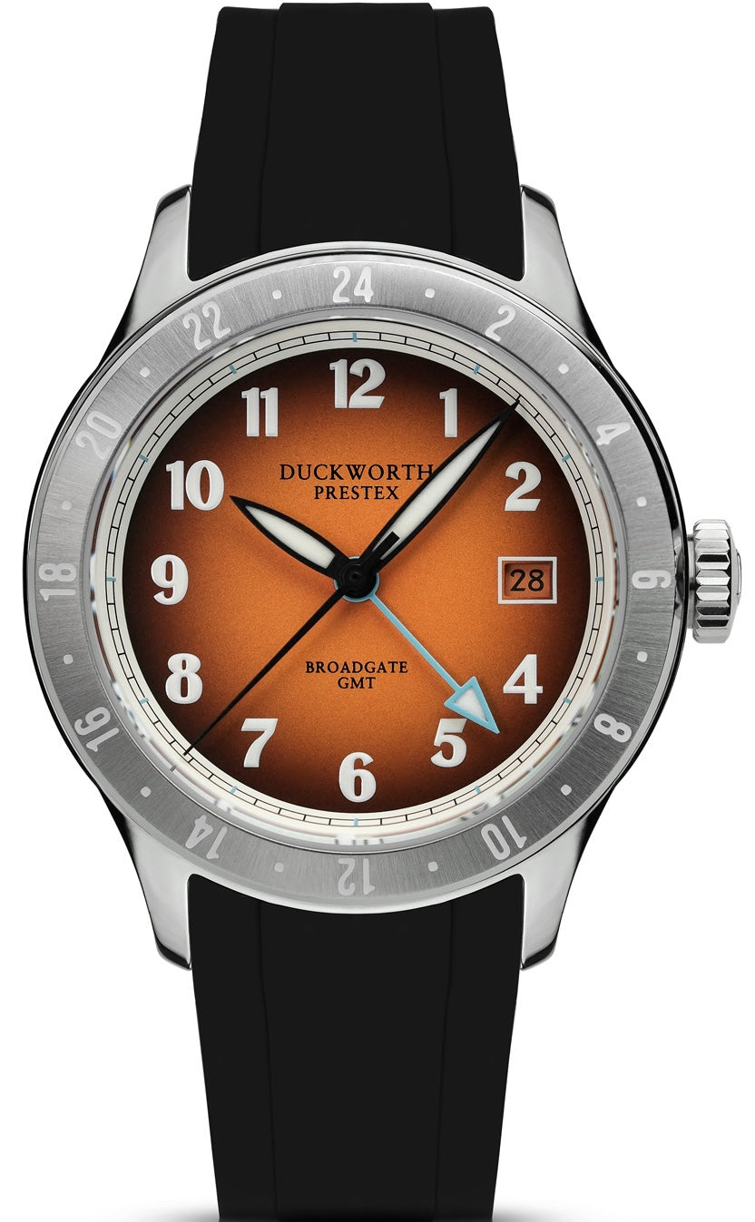 Duckworth Prestex Broadgate GMT Orange Black Rubber Watch D760-05-AR. The Broadgate 40mm round case automatic GMT. Taking its name the from the world famous financial centre in the heart of the city of London . This is an urban timepiece par excellence.